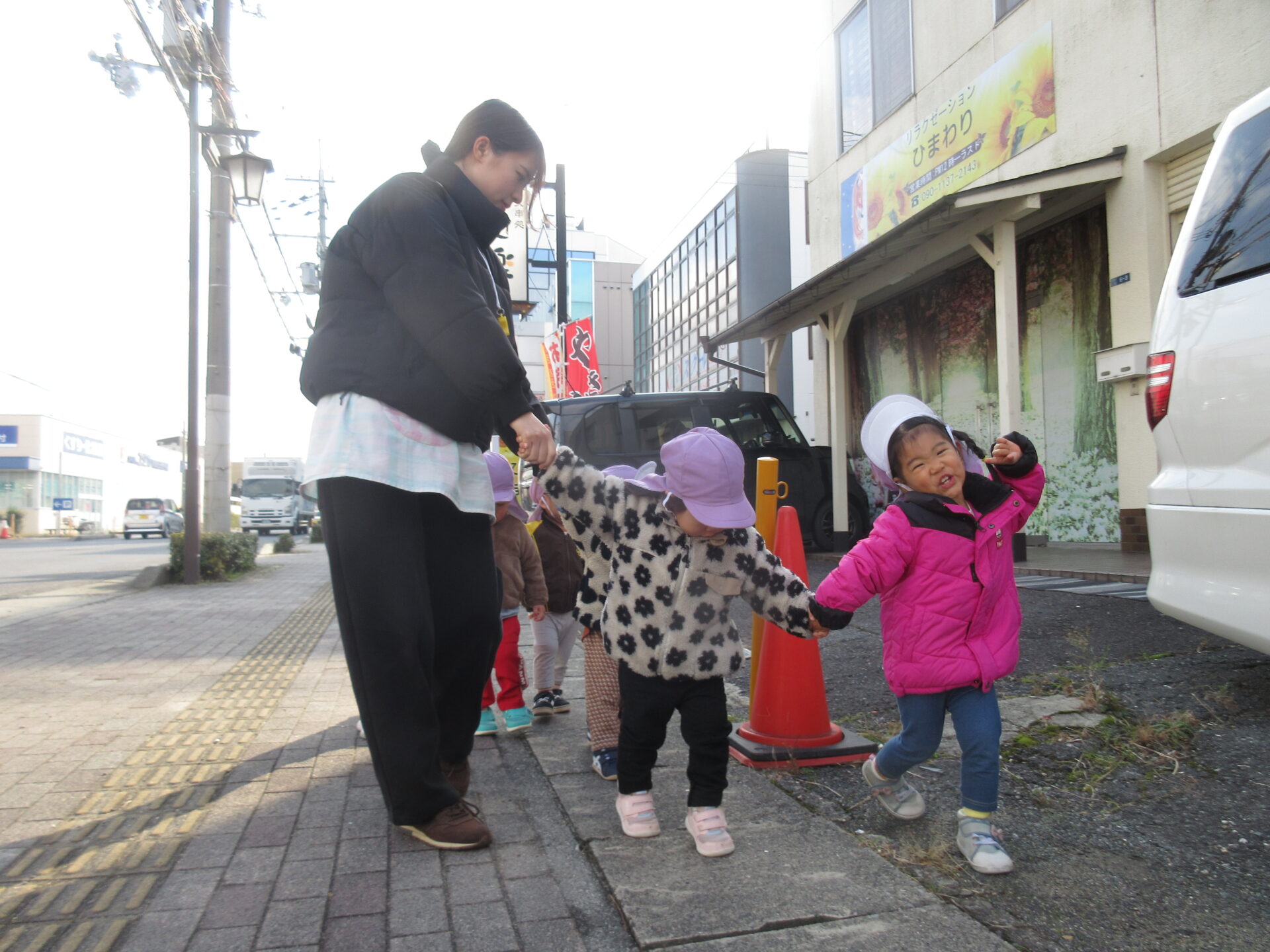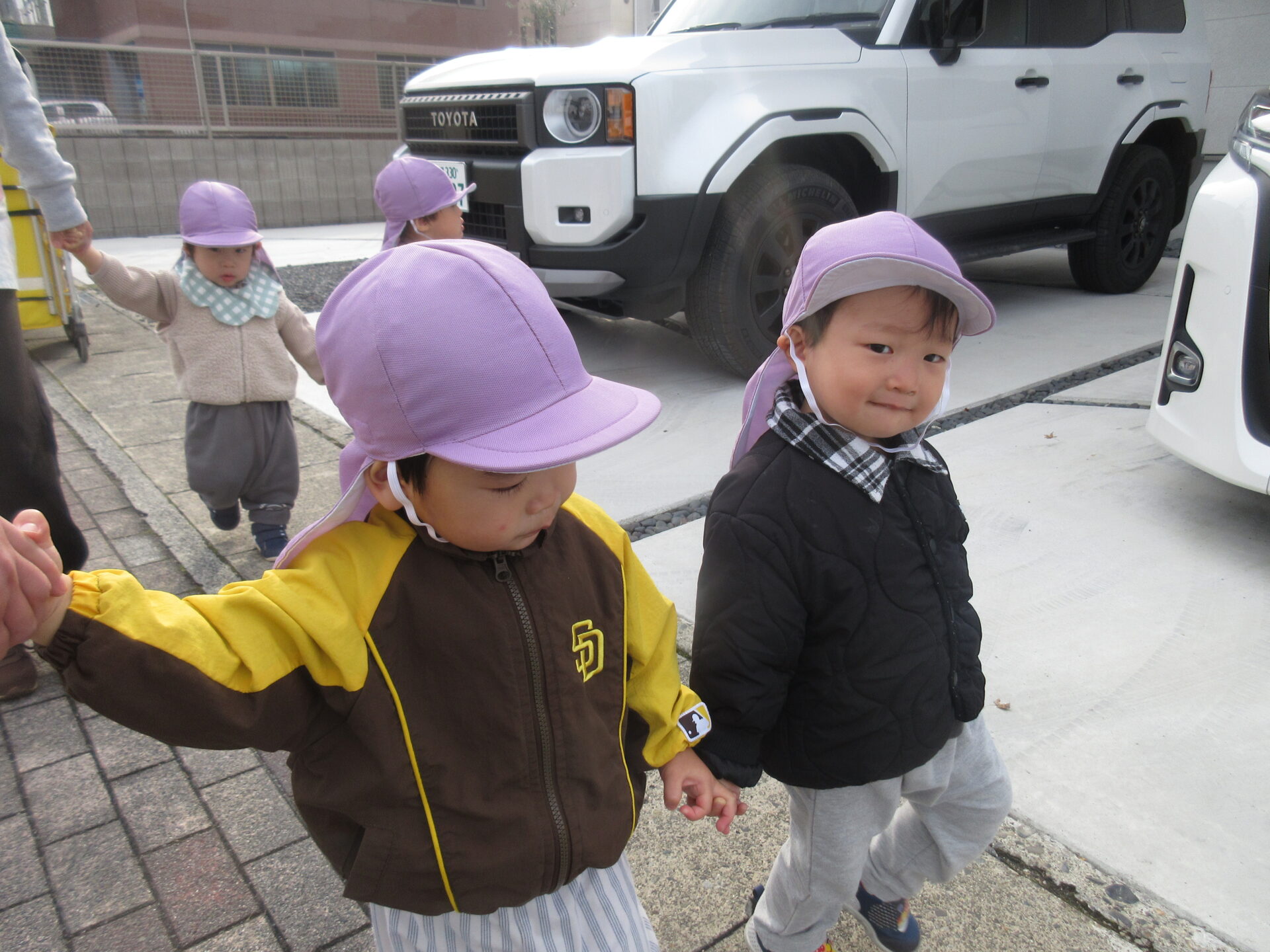 以前は避難車での外出が多かったのですが、最近は保育者やお友達と、手を繋いでお散歩をしています。