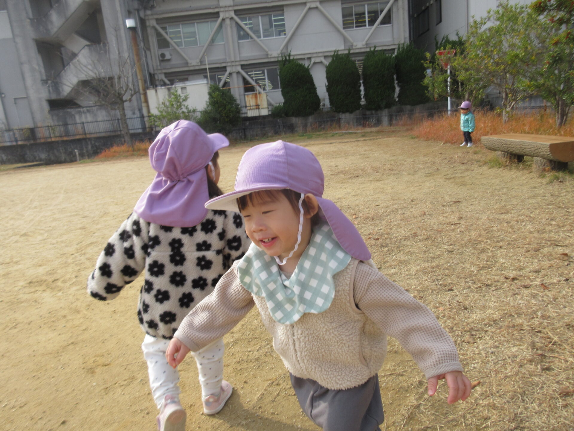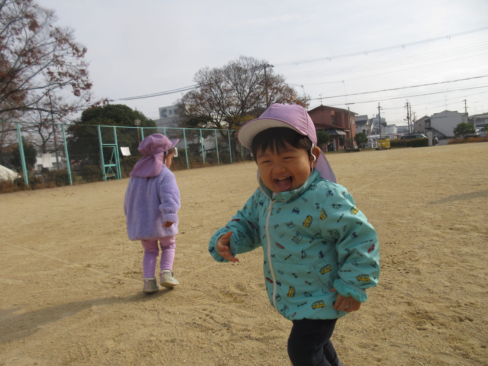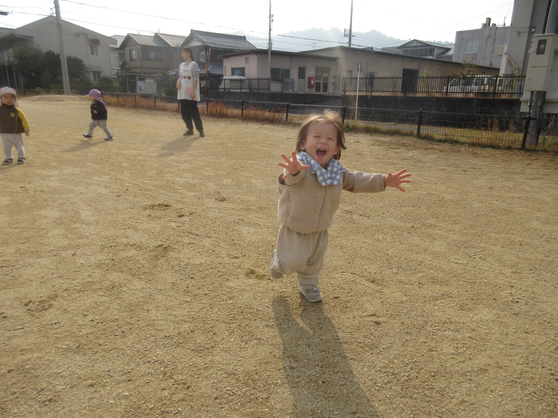 保育者と一緒にかけっこをしたり、シャボン玉を追いかけてみたり…。