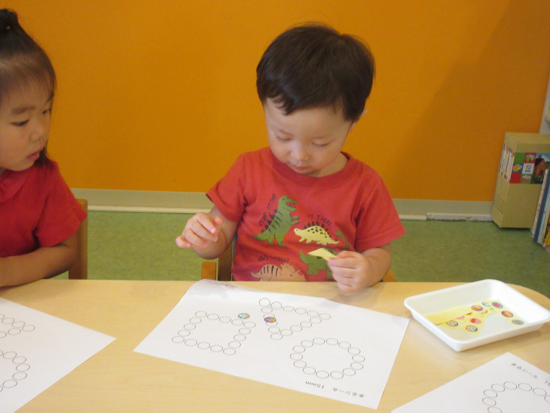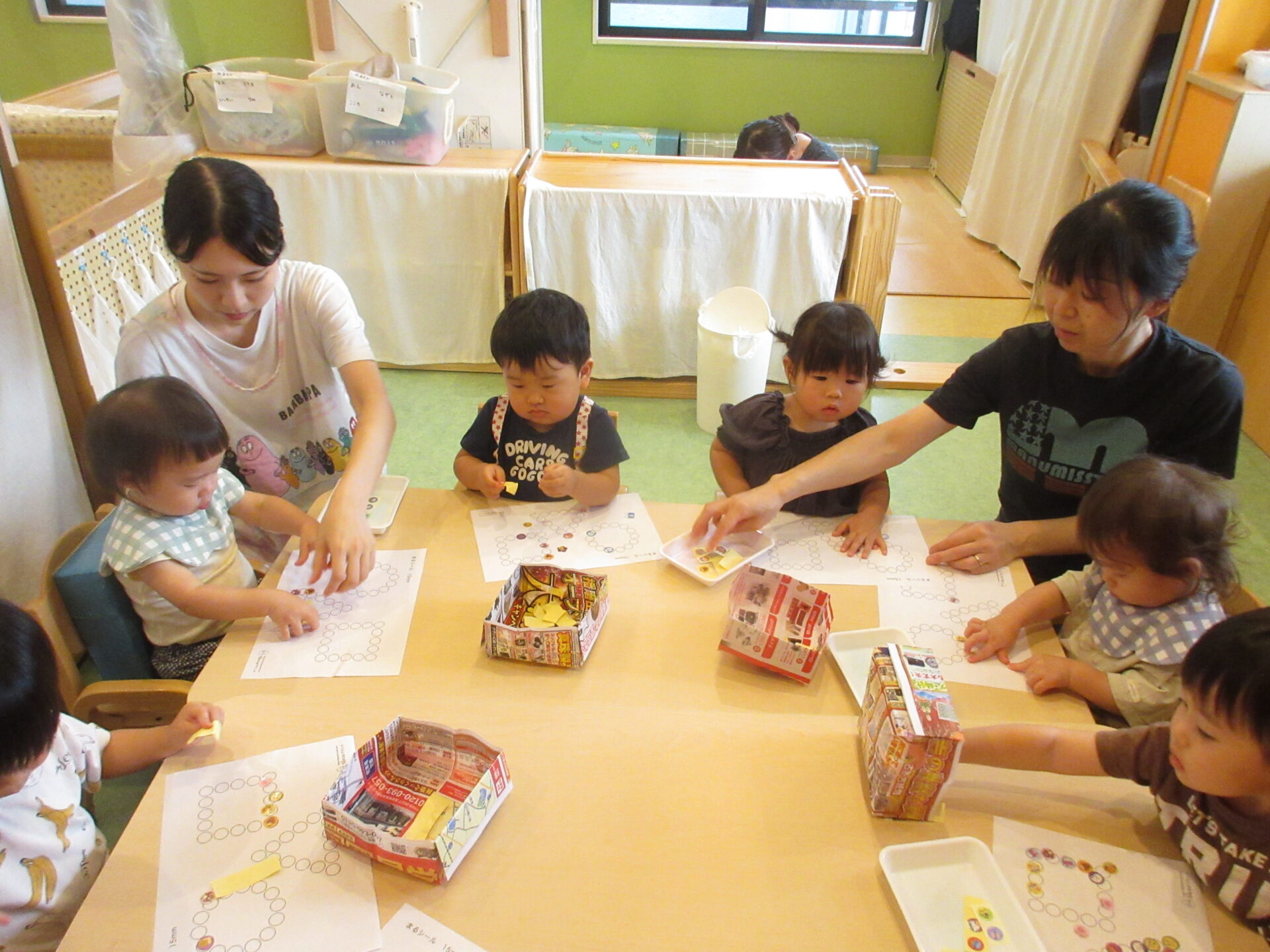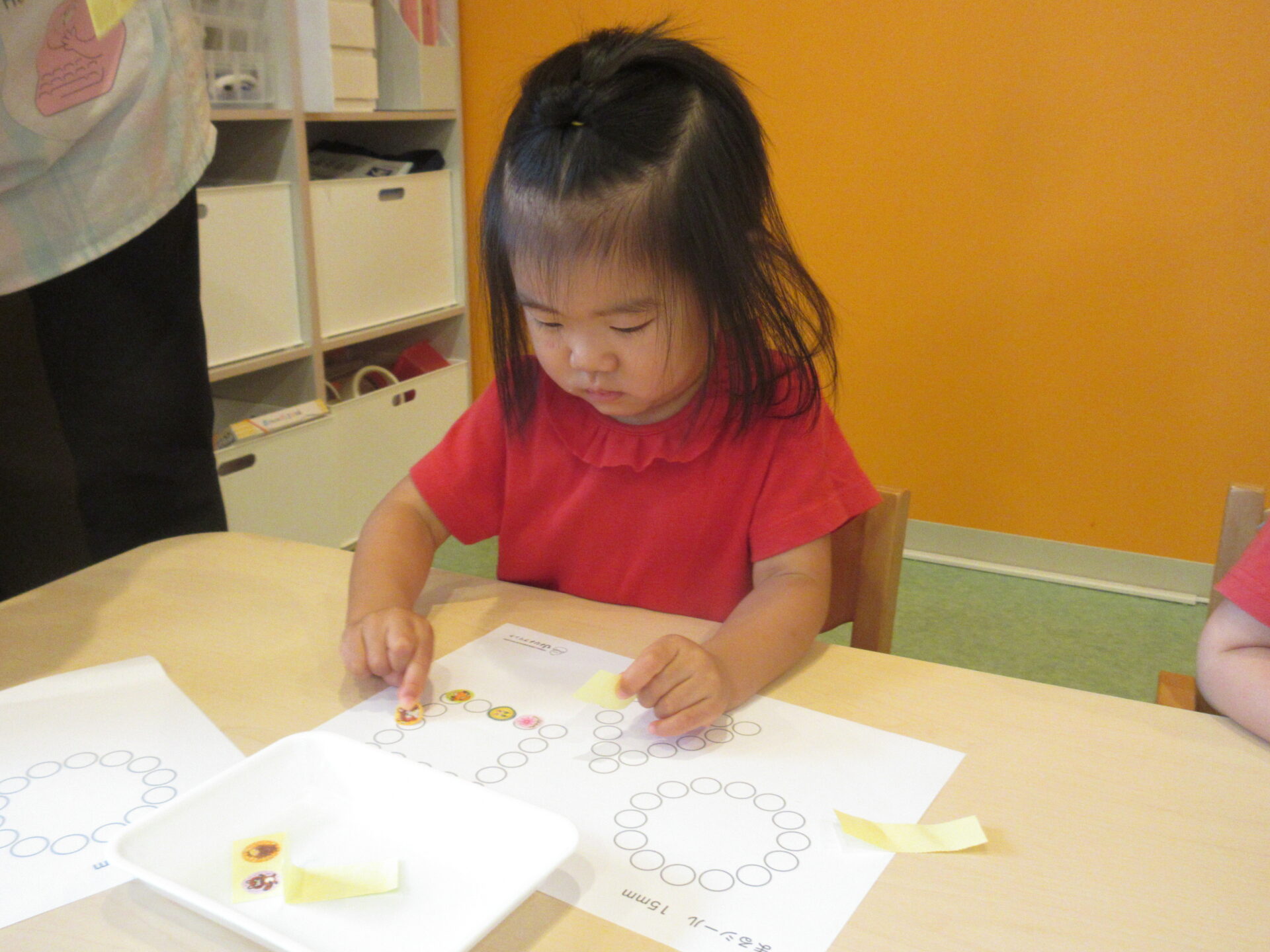 ○の中に納まるようにシールを貼るのが、まだむずかしいお友達もいます。