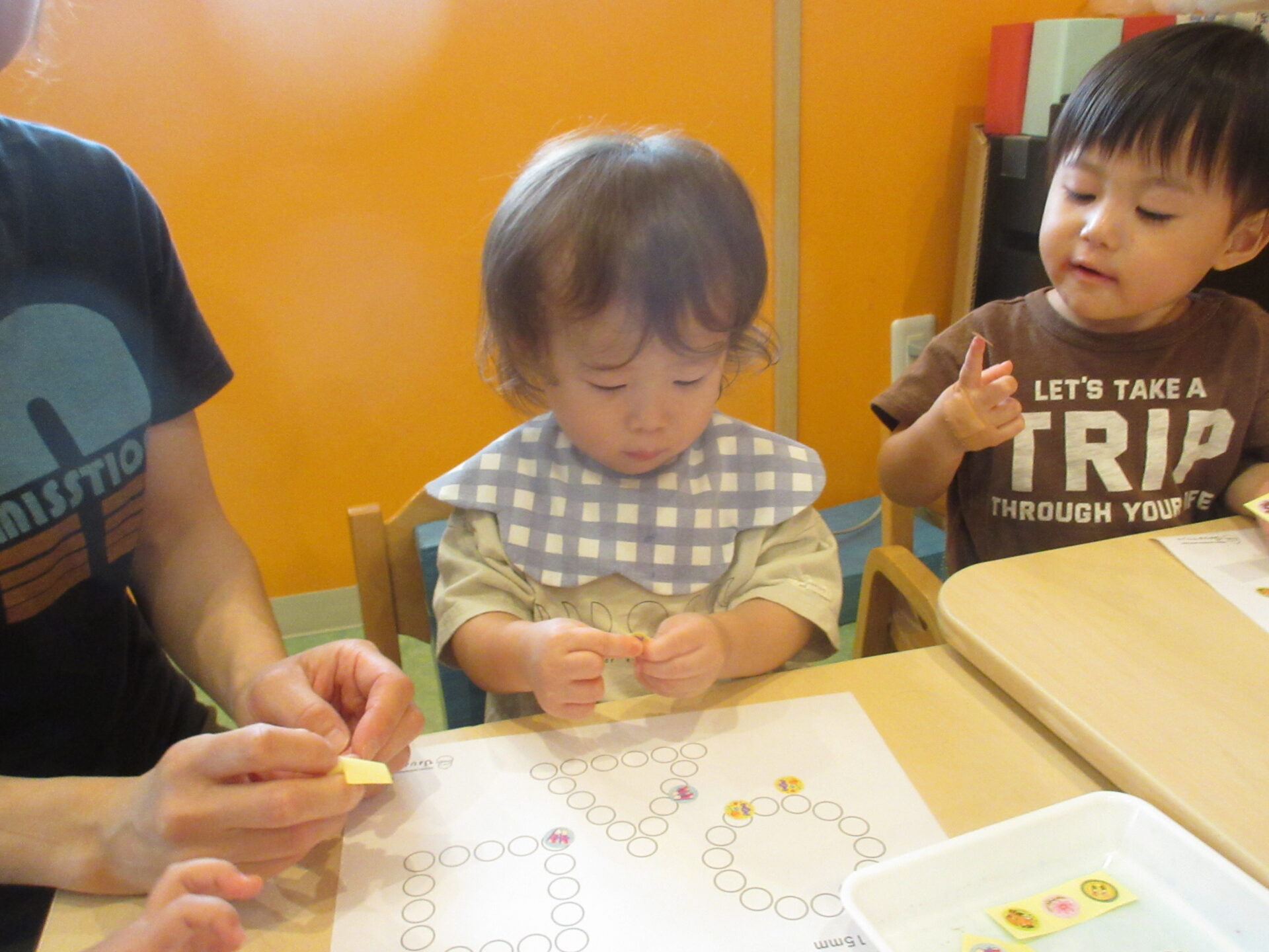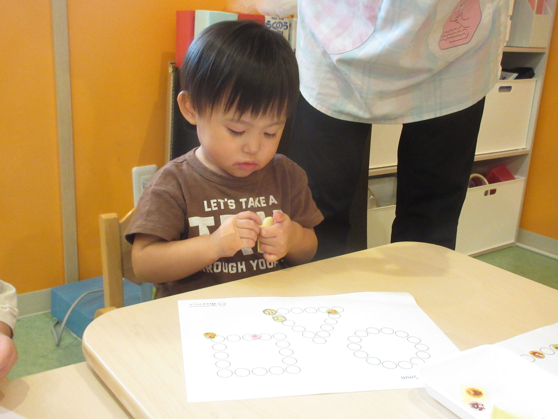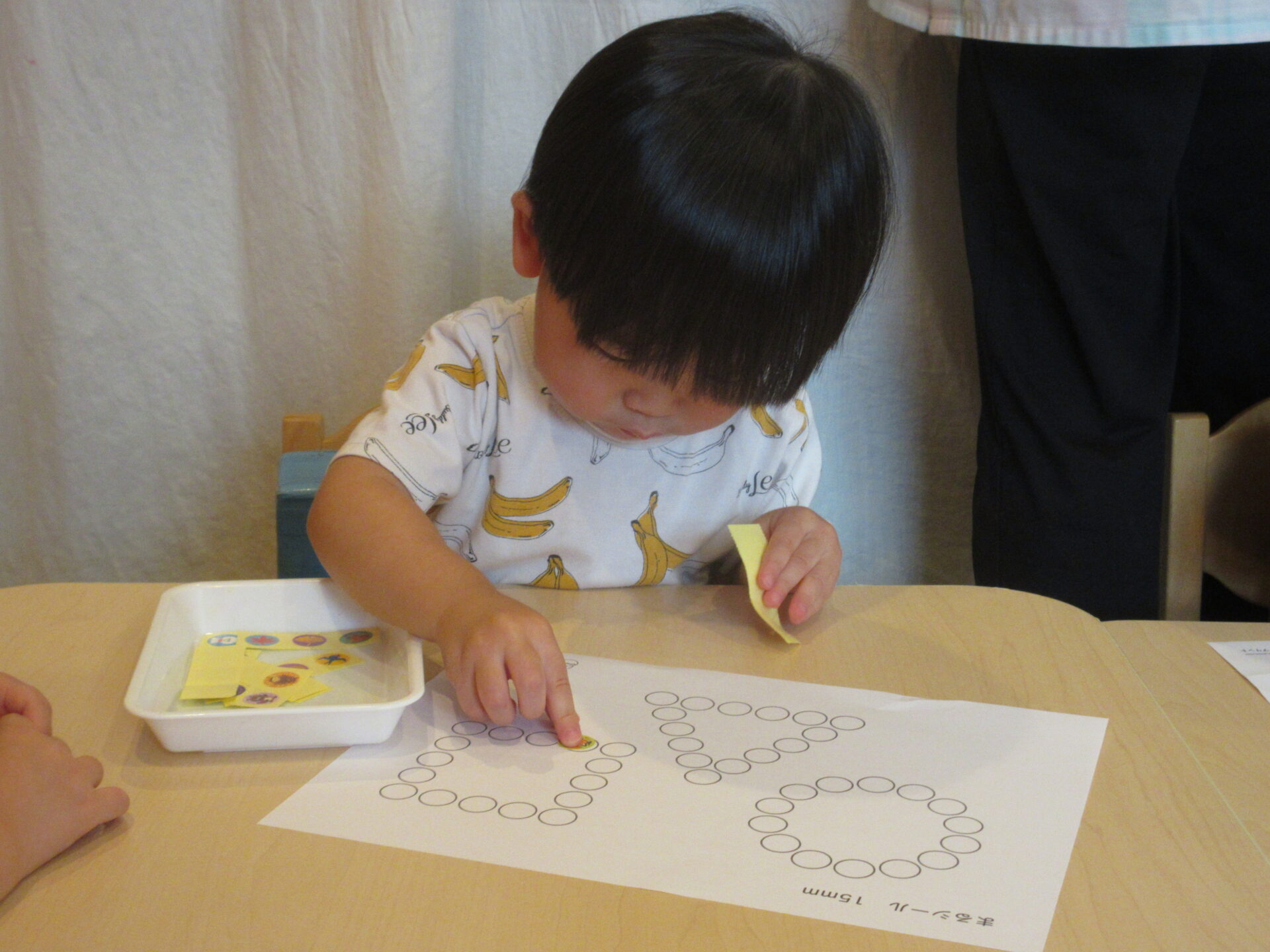○の中に納まるようにシールを貼るのが、まだむずかしいお友達もいます。