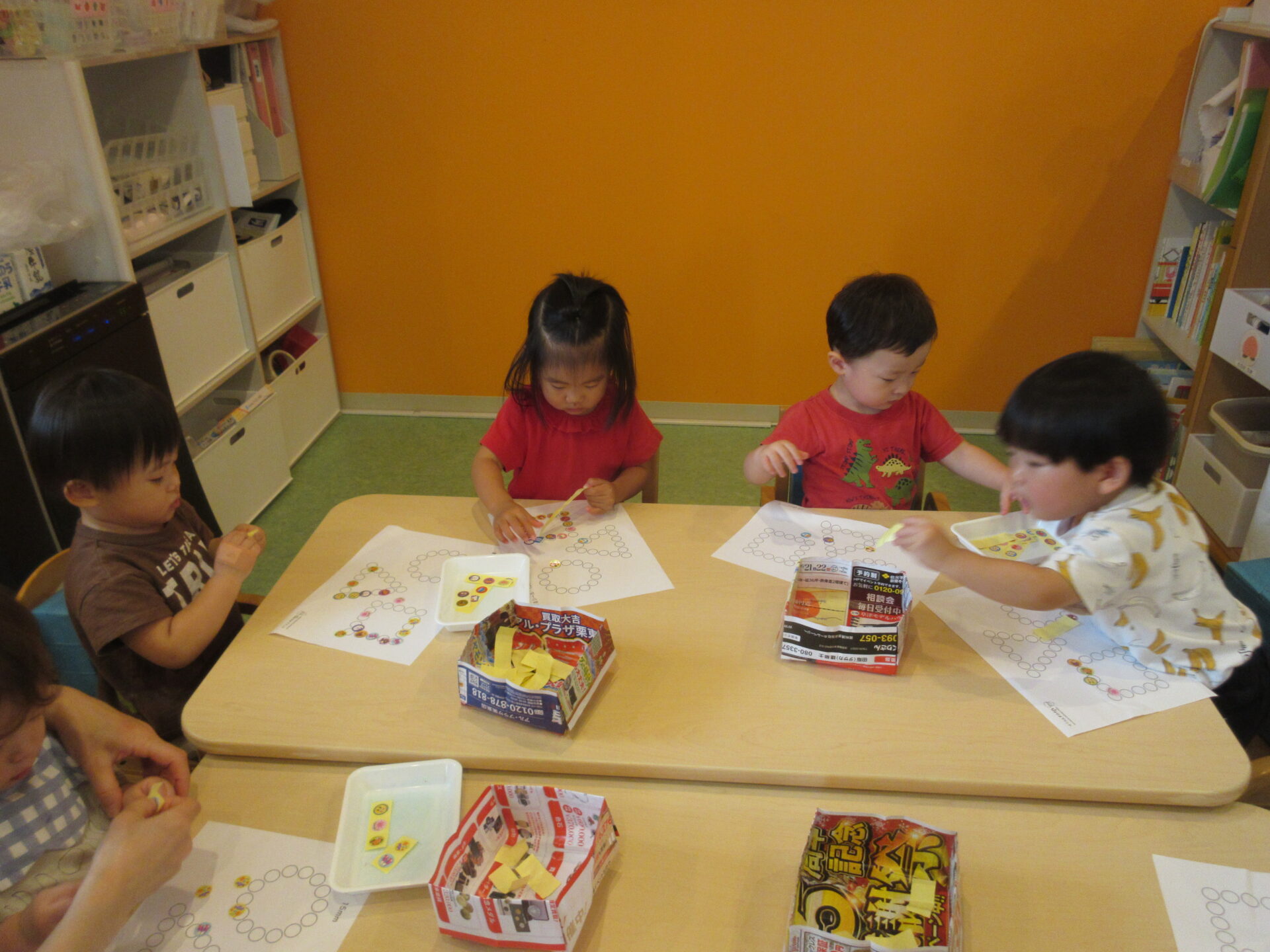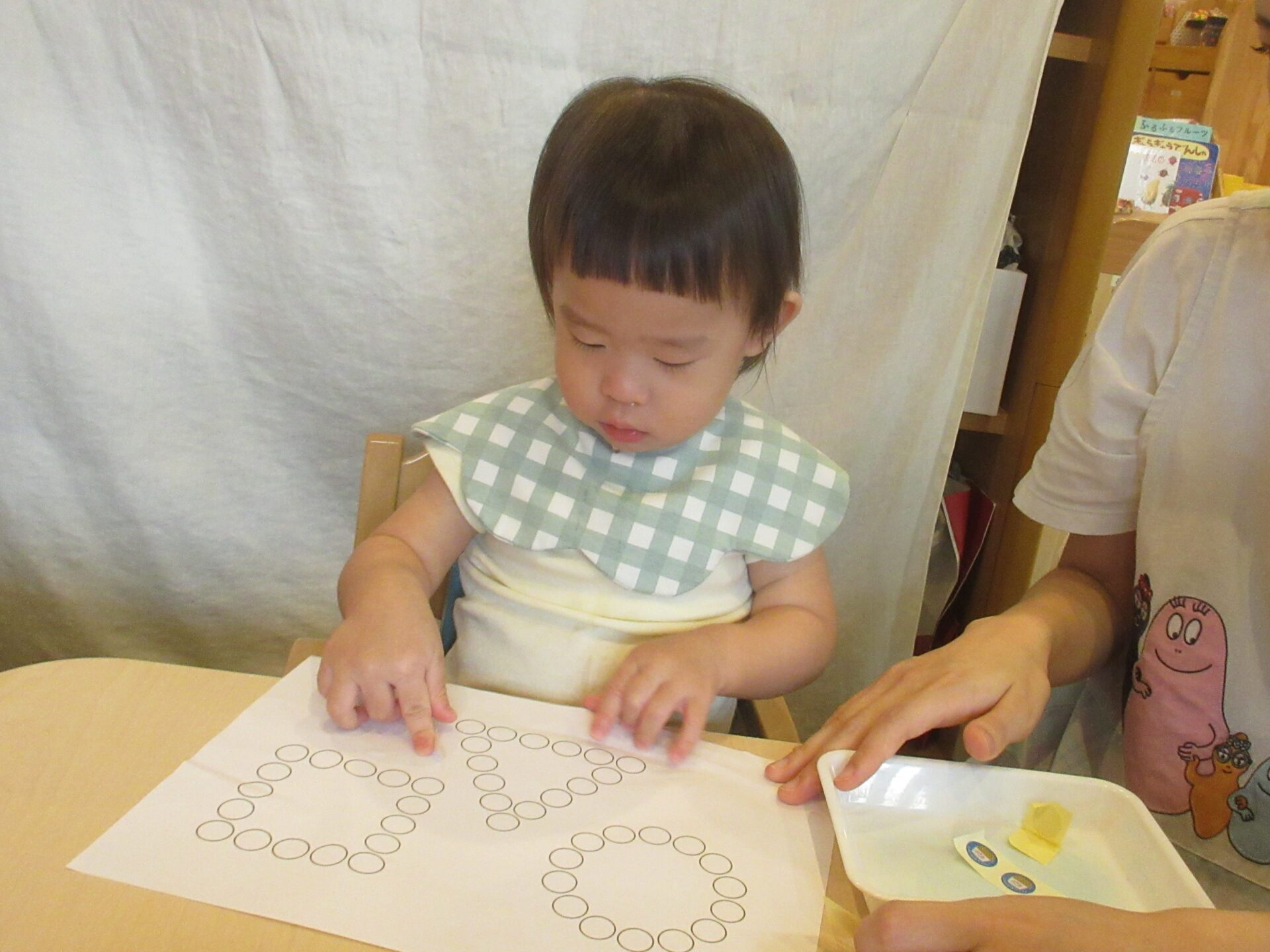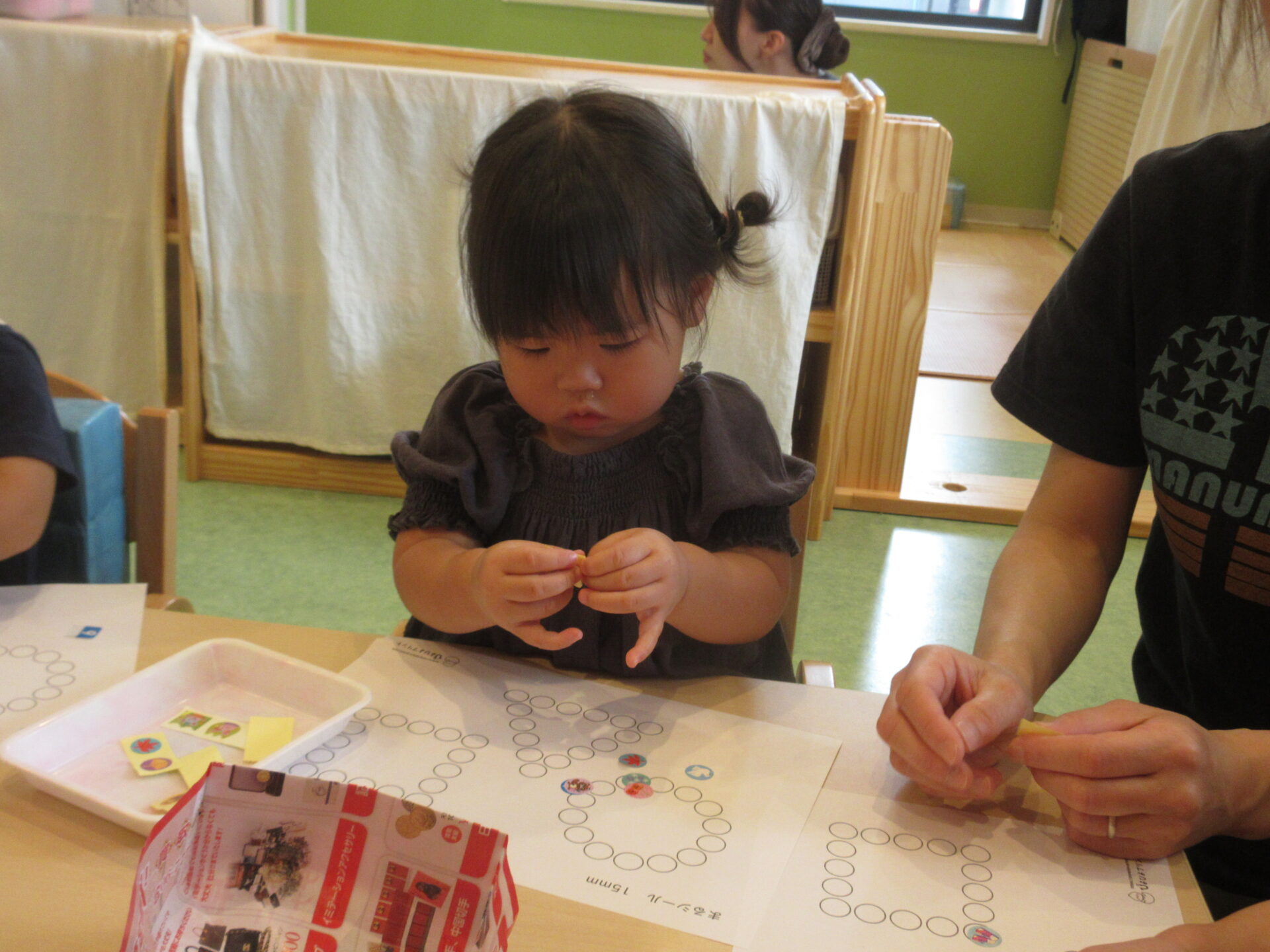 写真に写っている用紙の〇の中に、調子よく貼っていくお友達もいれば、慎重に狙いを定めて貼ろうとするお友達もいます。
