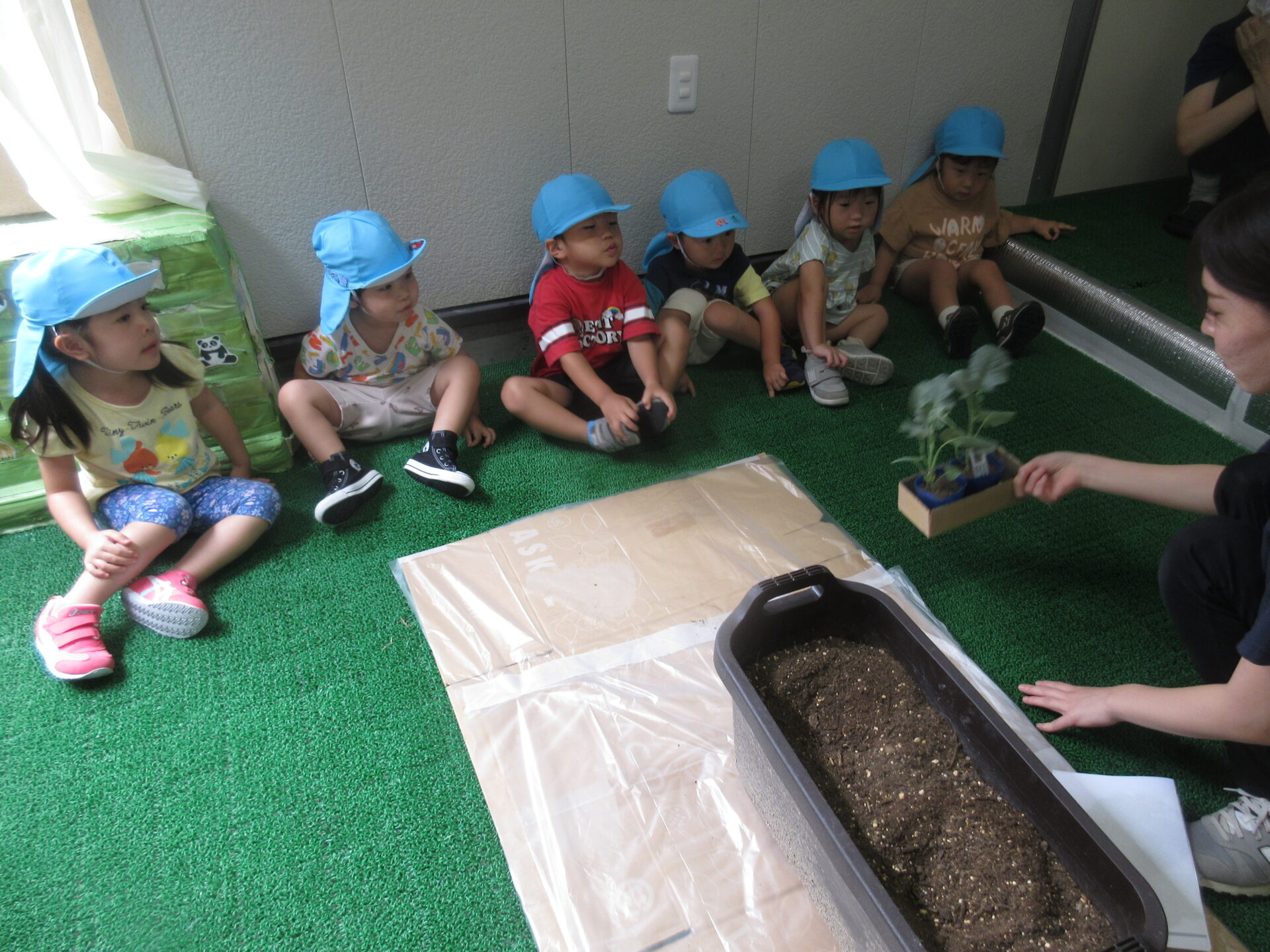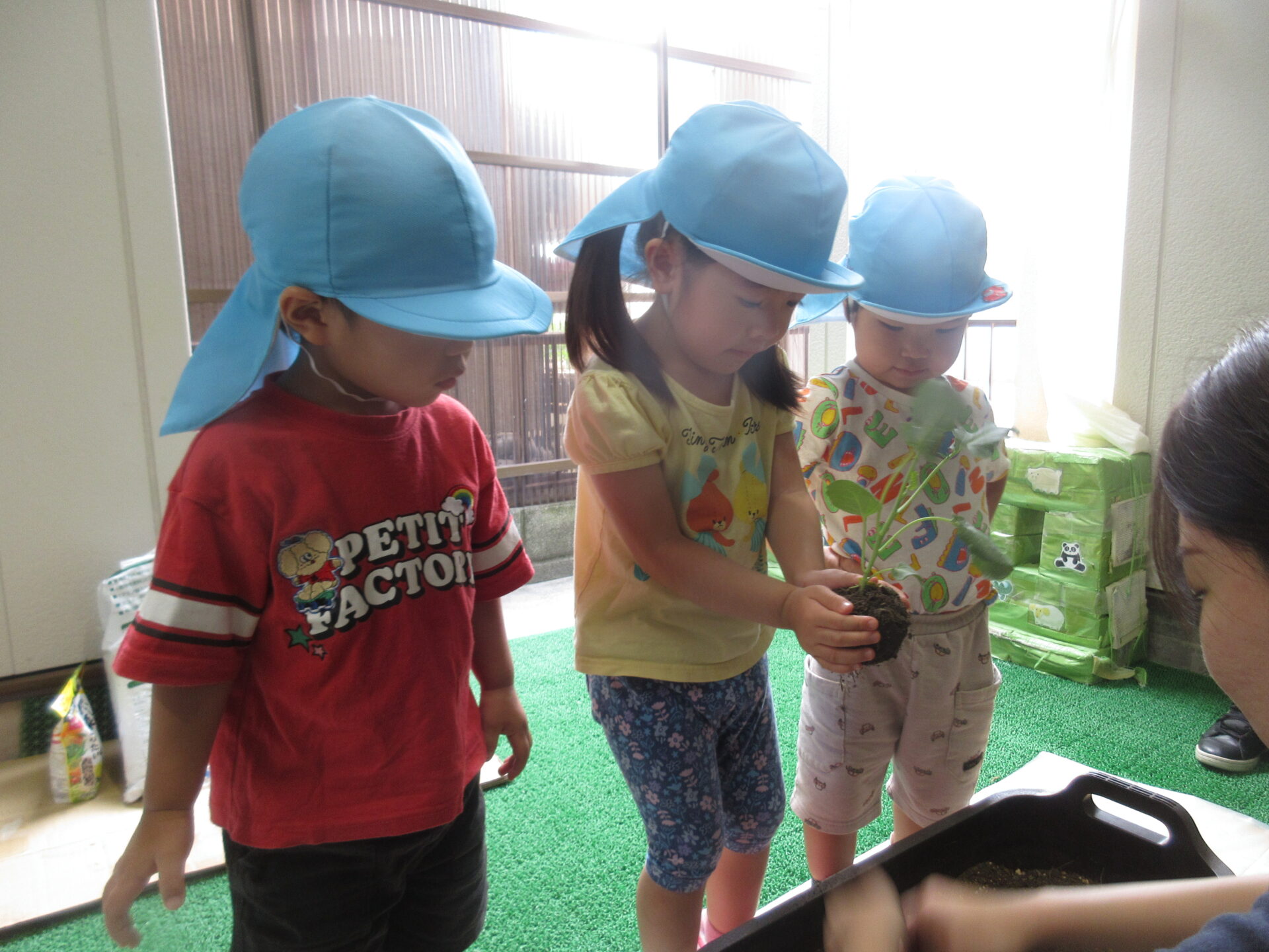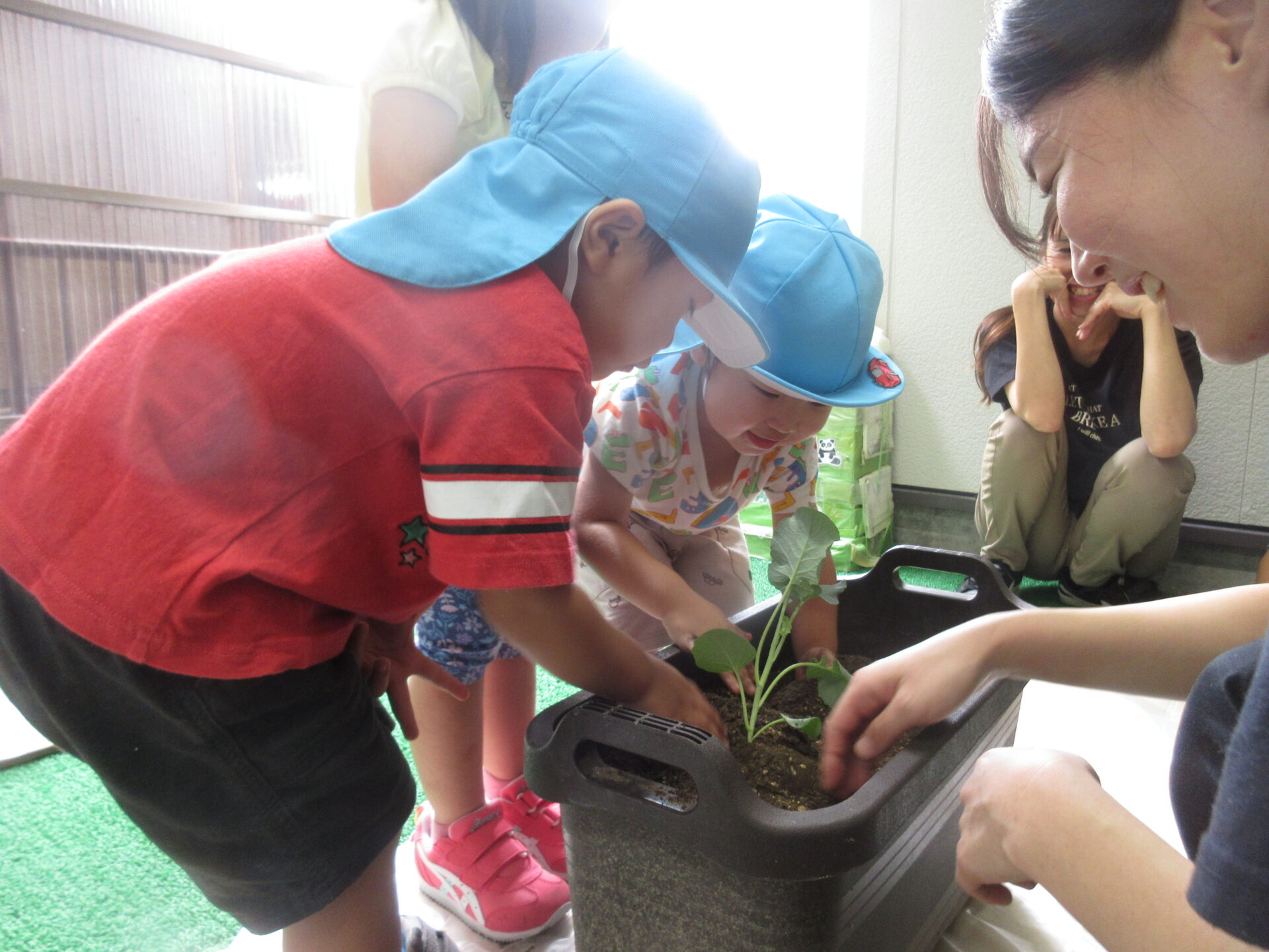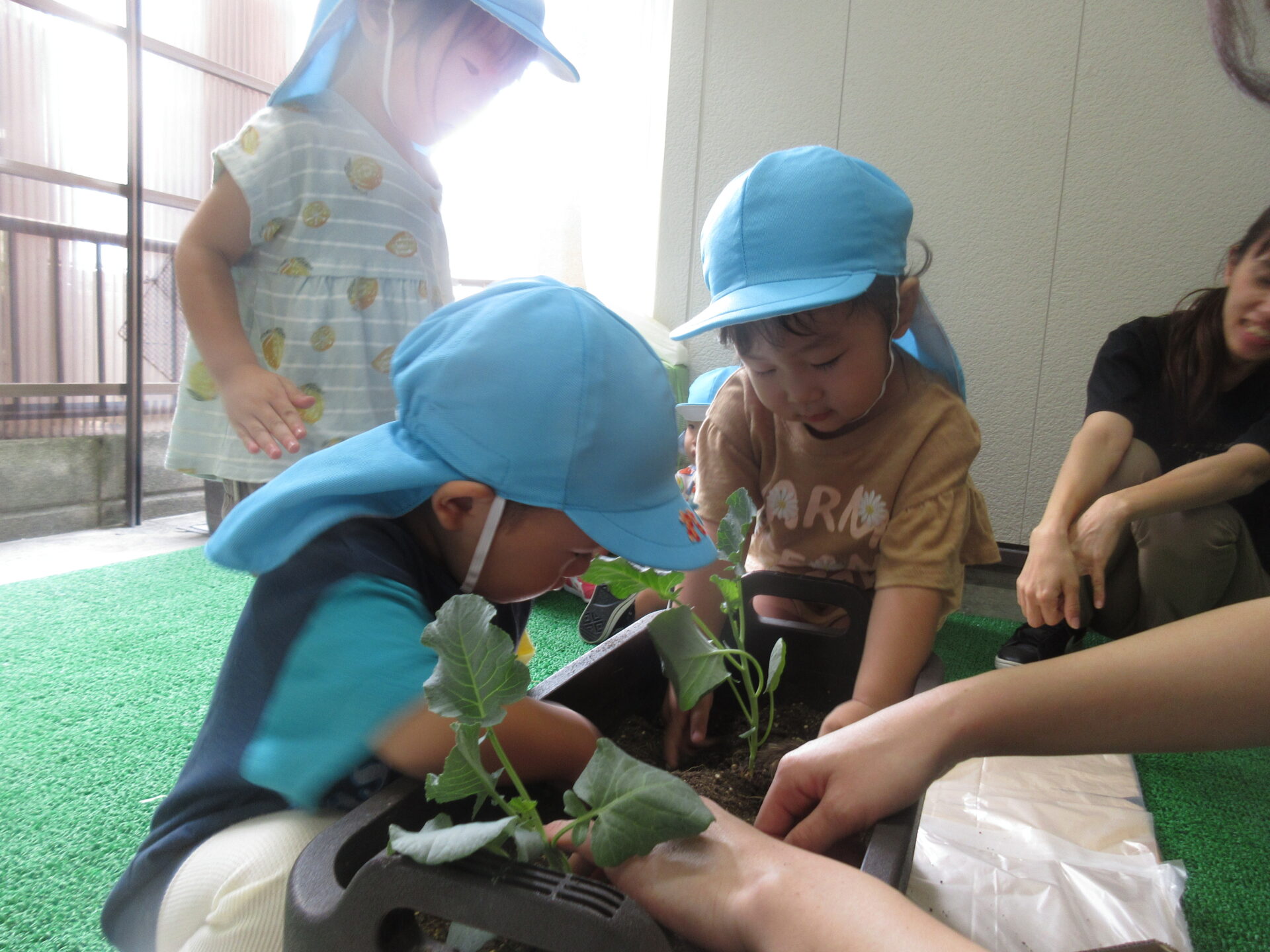 植えている最中に「土のお布団がないと、ブロッコリー大きくなれないんだよ」と保育者が話すと、しっかりと土をかけてくれていました。