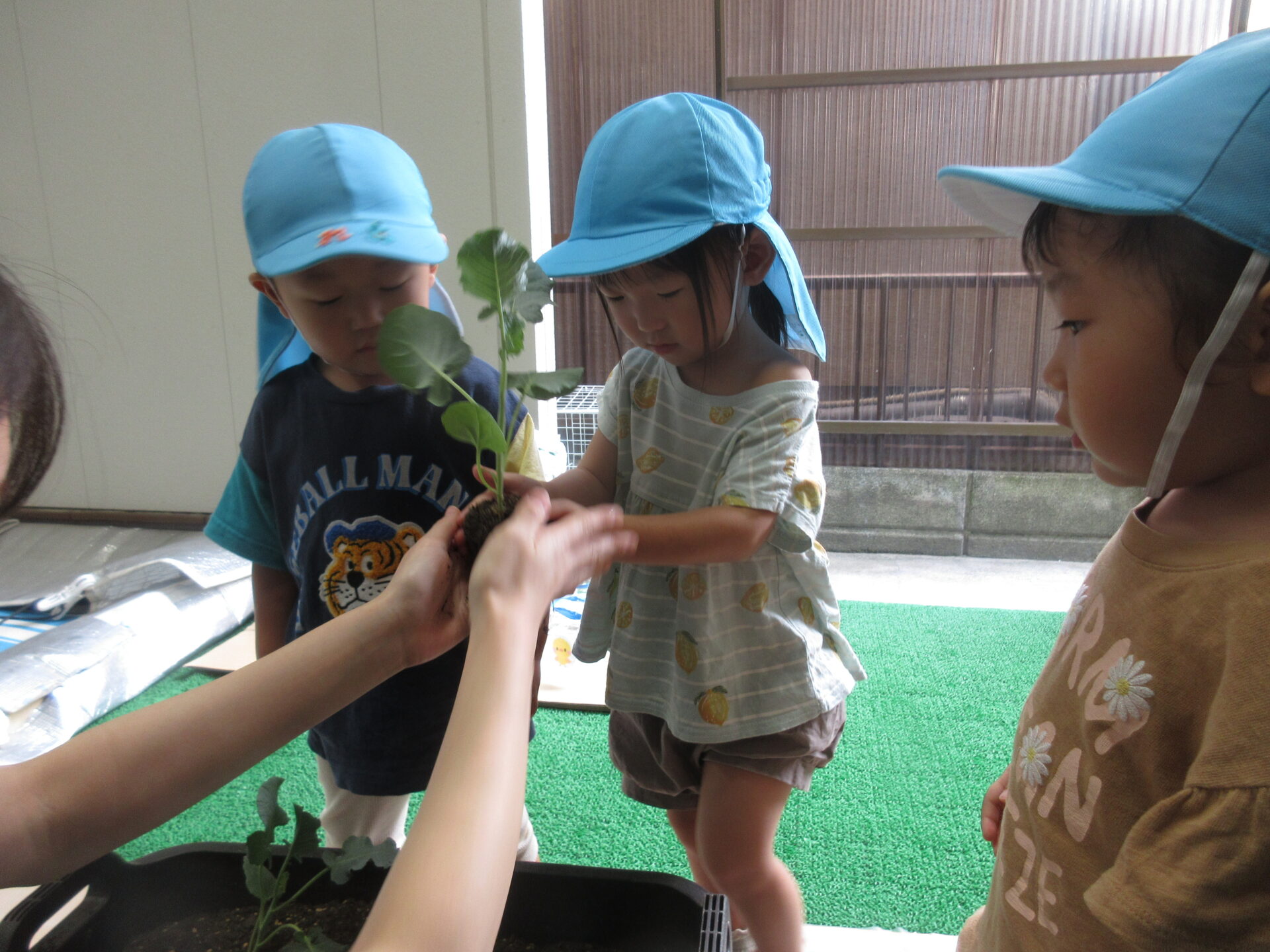 苗をみて「この苗がブロッコリーになるよ」と教えてもらいましたが、みんなの知っているブロッコリーの形とは違い、不思議そうな表情です。