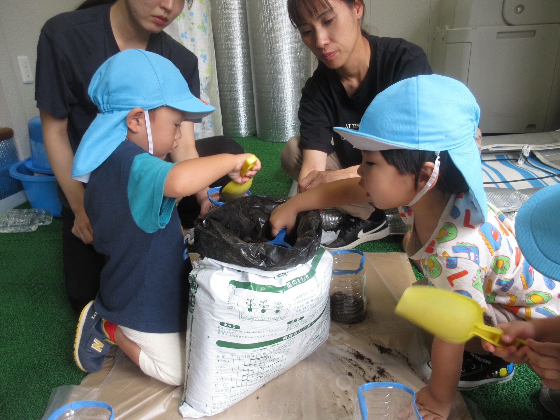 保育者が「土がこぼれないようにそ~っと入れてね」と伝えると、慎重にスコップですくって入れてくれました。