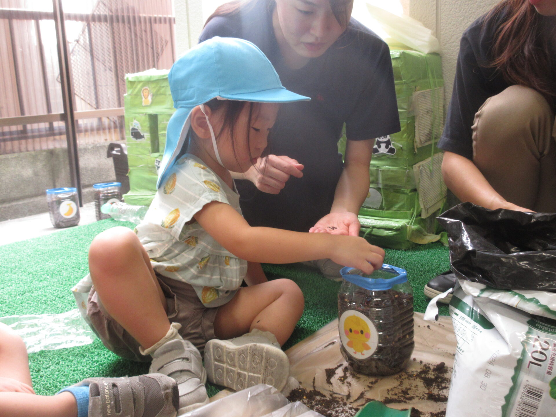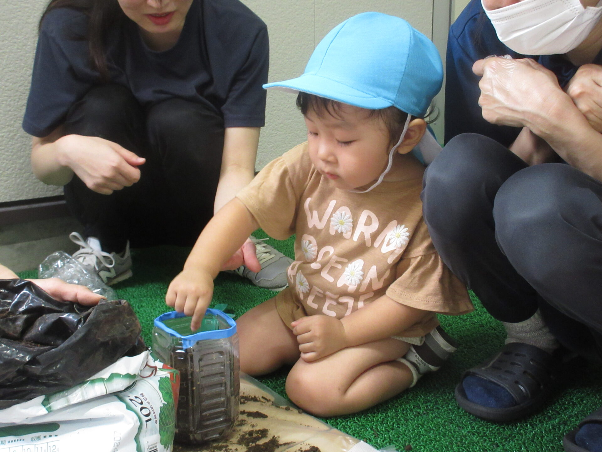 「ここ(でいいの)?」と、保育者に確認しながら、穴をあけた部分に慎重に種をまいてくれましたよ。