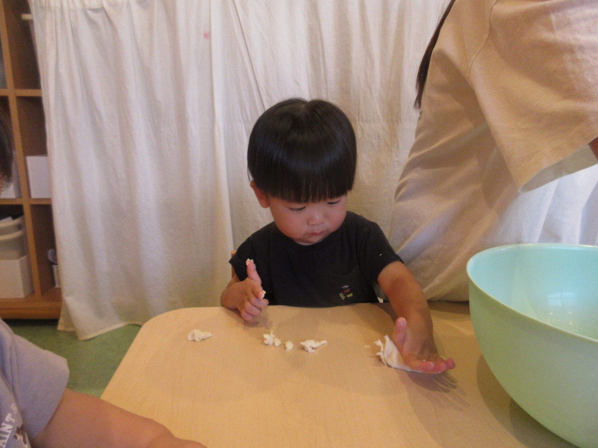 遊びが進むと、小さく千切ったり、手のひらでこねたりと、思い思いにねんどで遊びます。