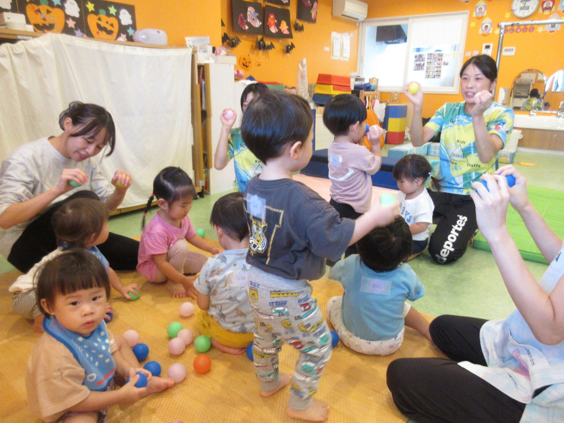 カラーボールを転がしたり、オニギリみたいに手で握ってみたりして、ボールと仲良くなりましたよ♪