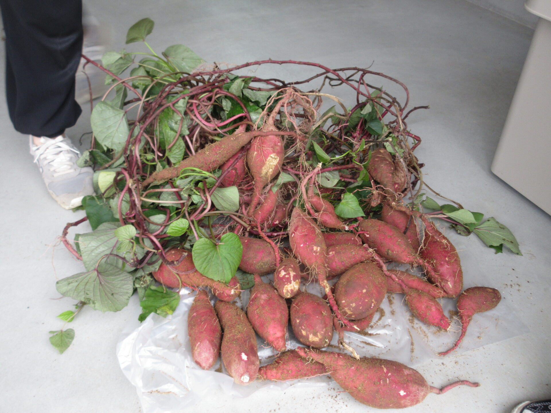 掘ったさつまいもを、土がついたままの状態で土間で陰干しし、後日新聞紙でくるみました。