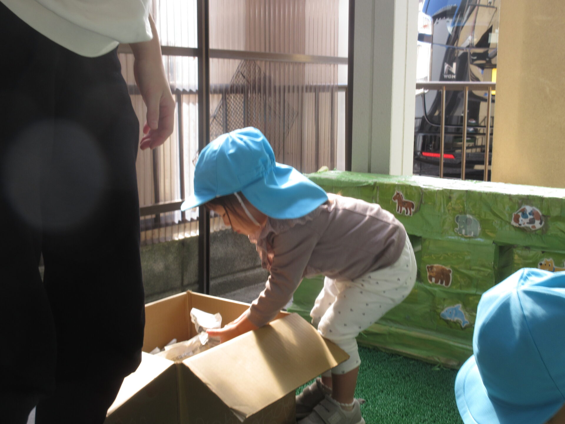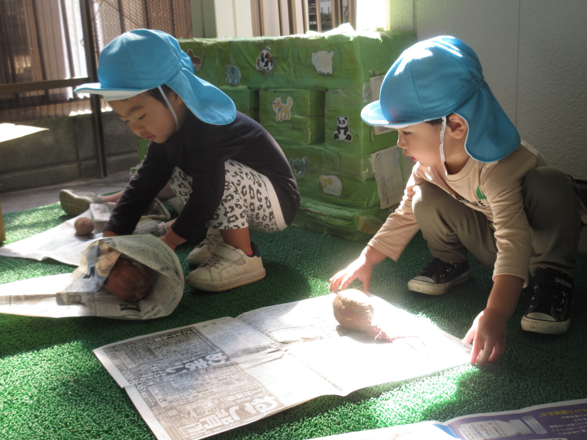 「包んだおいもはお家に入れてあげてね」と伝えると、優しくお芋をダンボールのおうちへ…。