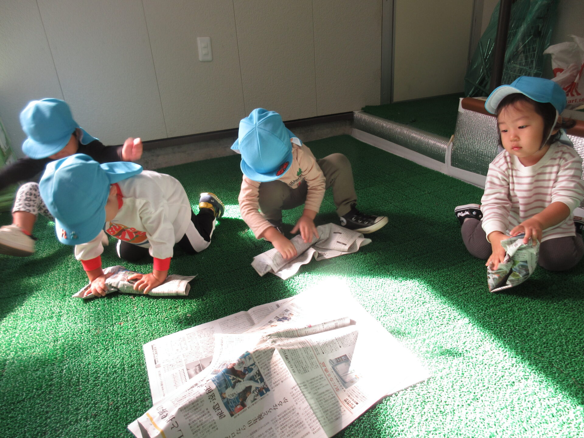 みんなに「あまいお芋さんになるように、新聞のお布団でくるんであげてね」と説明すると、上手にクルクルとさつまいもを包んでくれました(⌒∇⌒)