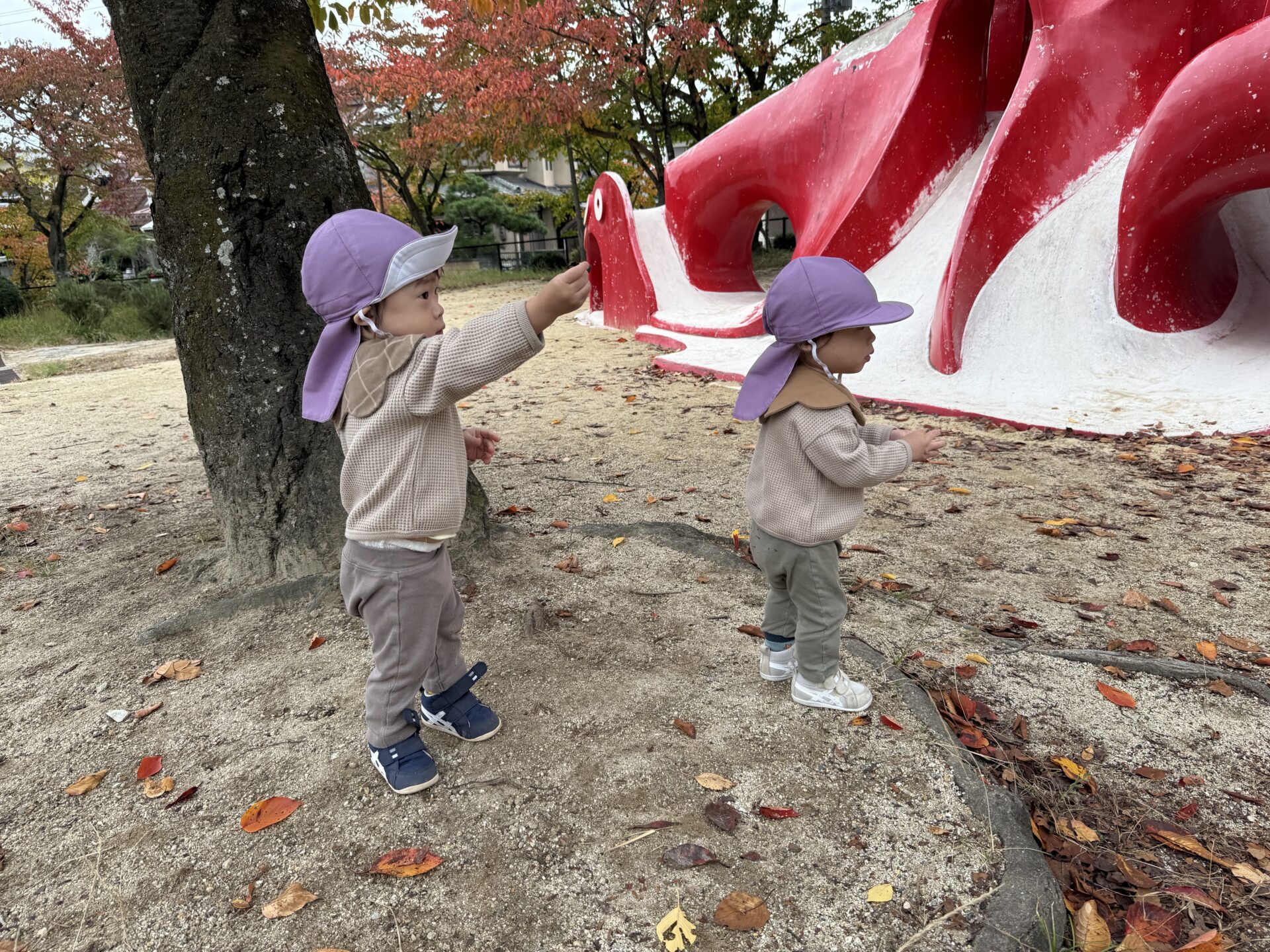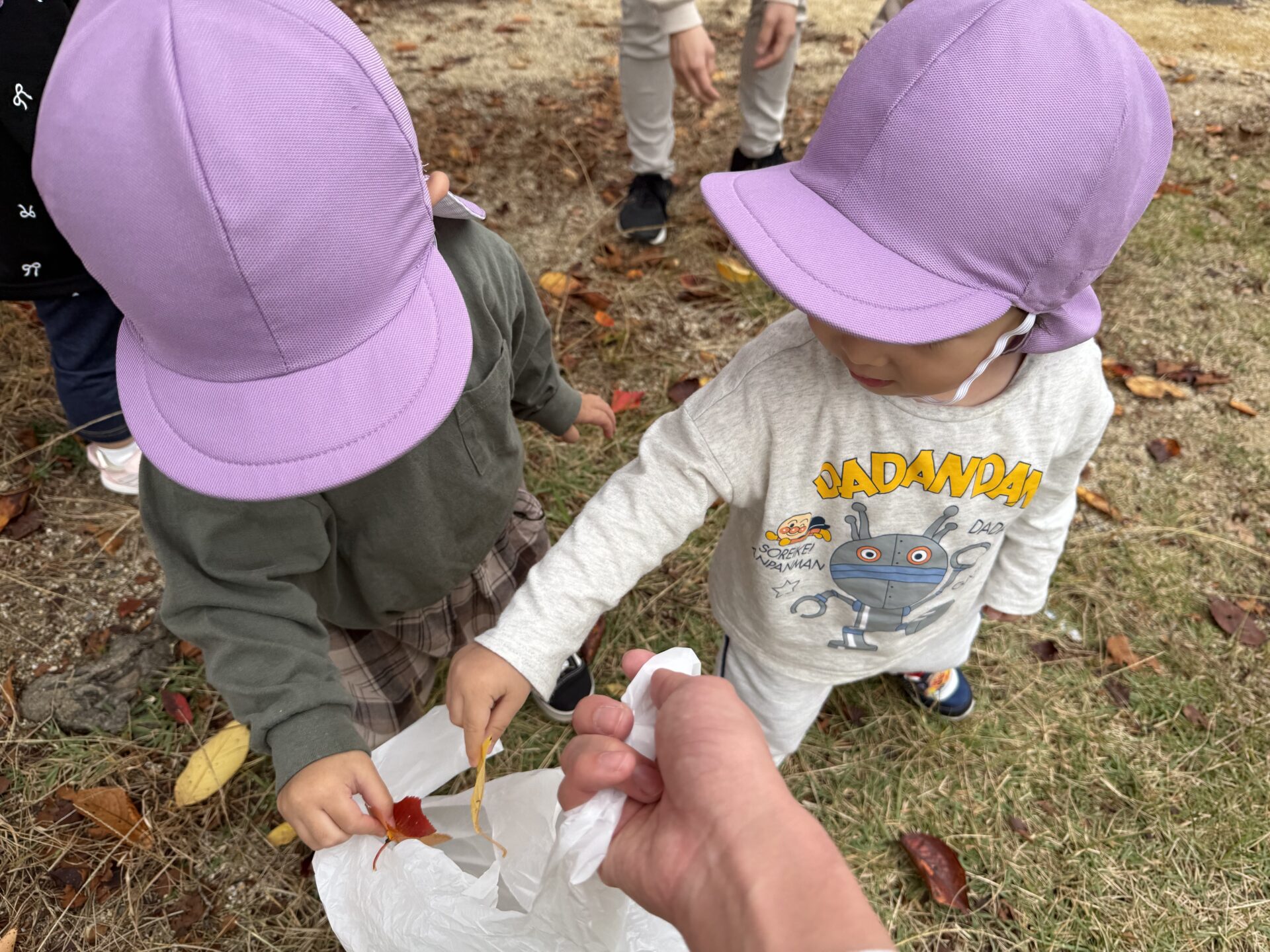 拾った落ち葉を、宝物のように見せてくれる可愛い子どもたちです♡