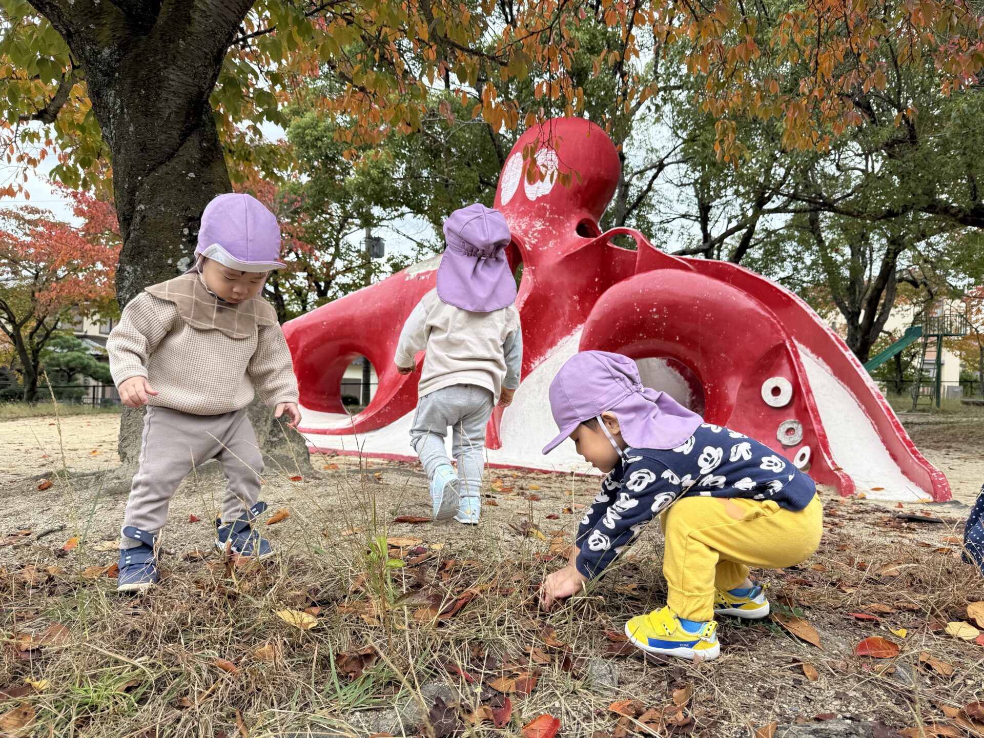 落ち葉がたくさん落ちている木の下で、子ども達は下を向いてキョロキョロ…。