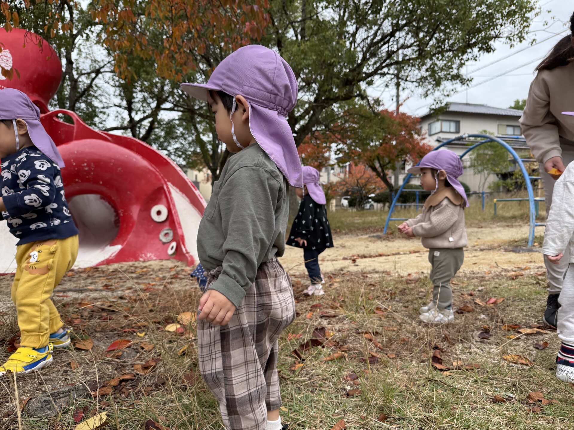 園から公園へ着くと「今日は落ち葉拾いをしようね。落ちている綺麗な色の葉っぱを取ってきてね!」と、保育者がみんなに伝えました。