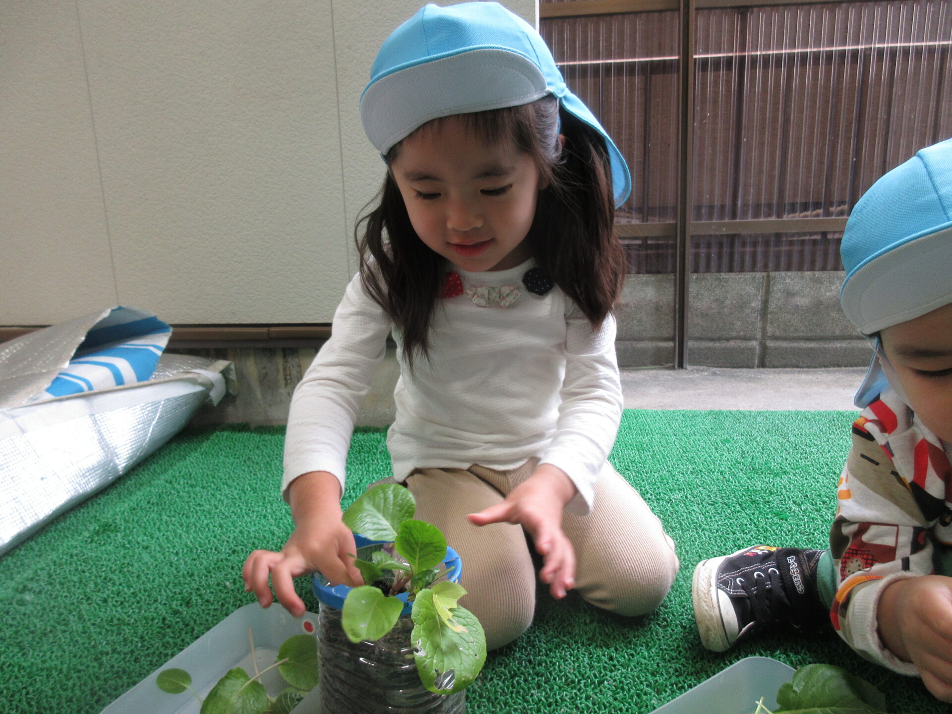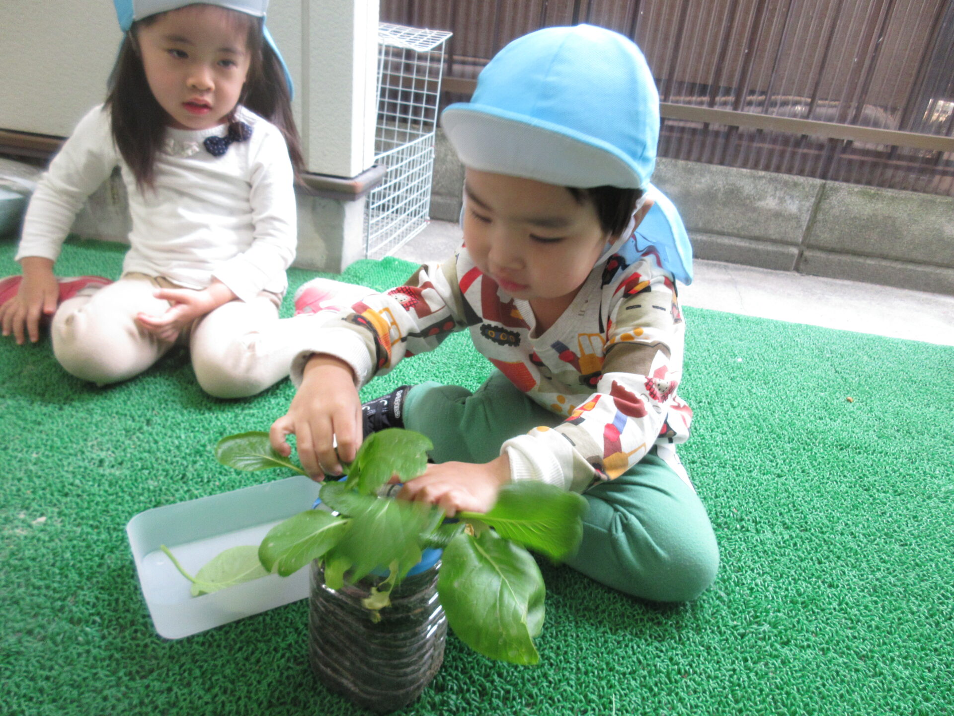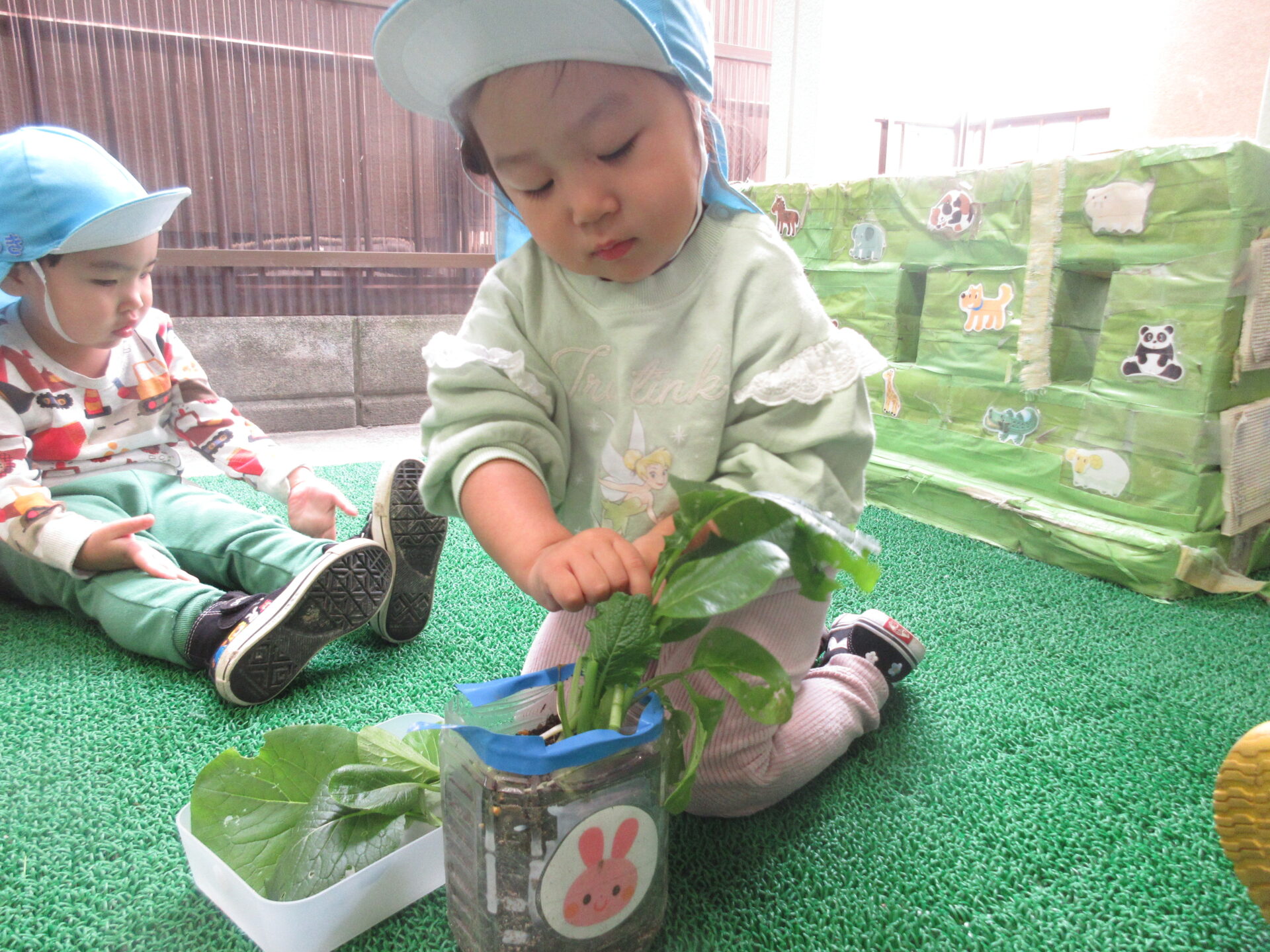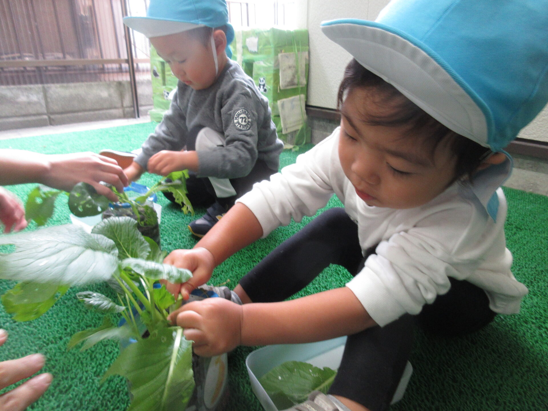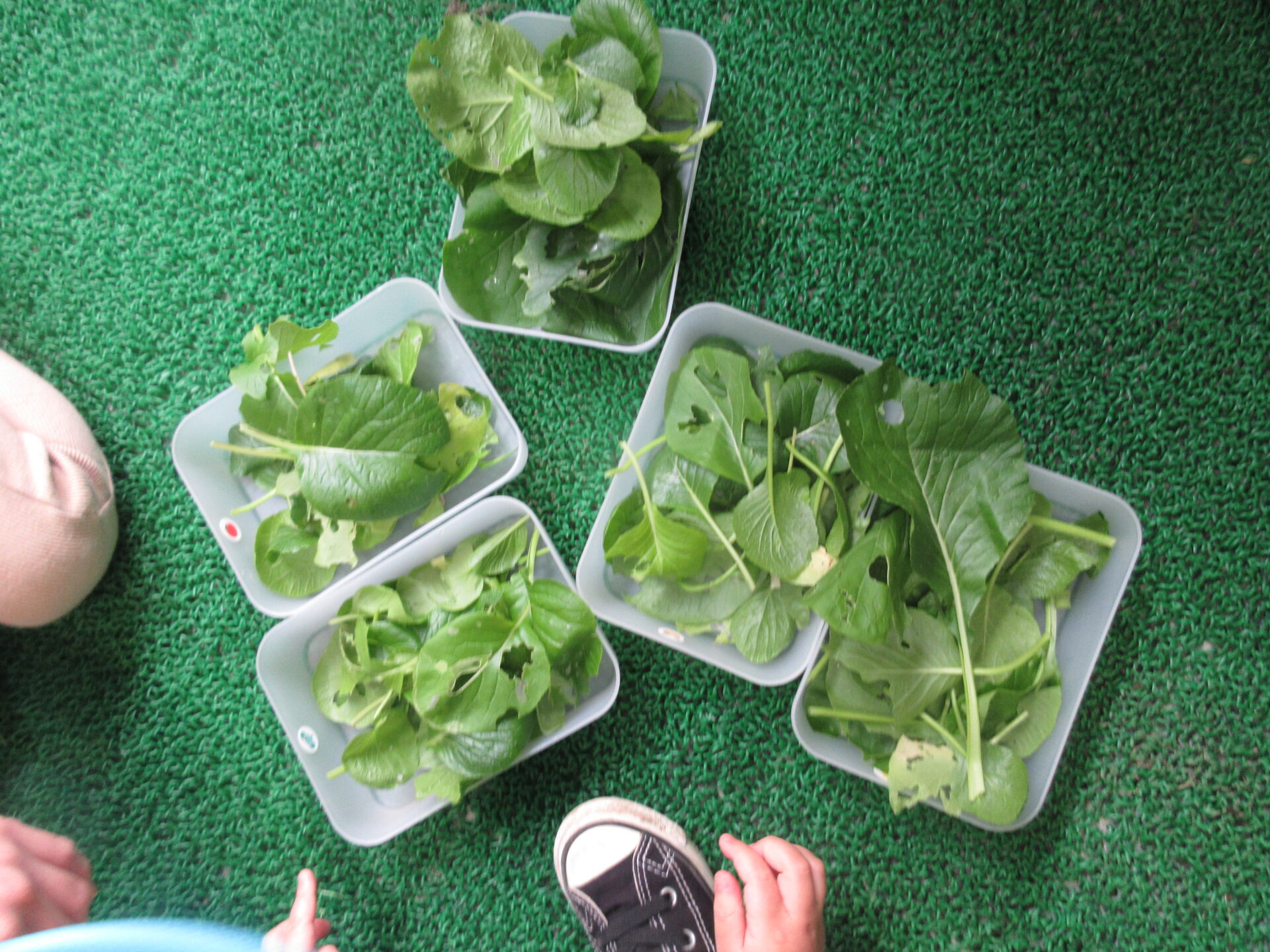 収穫途中、青虫さんも登場し「虫さんも食べにくるくらい美味しい小松菜なんだね~!」と、みんなでお話していましたよ♪
