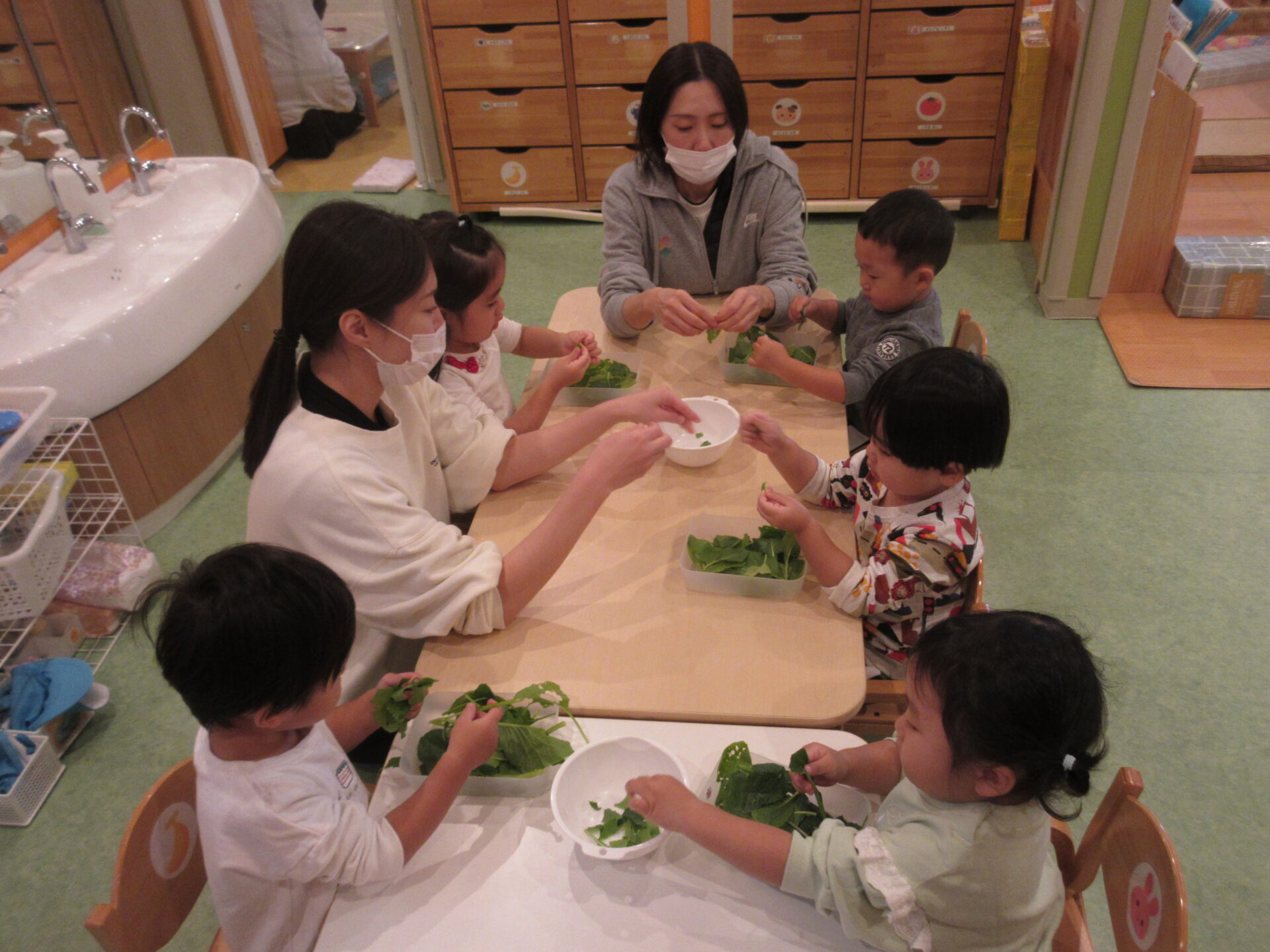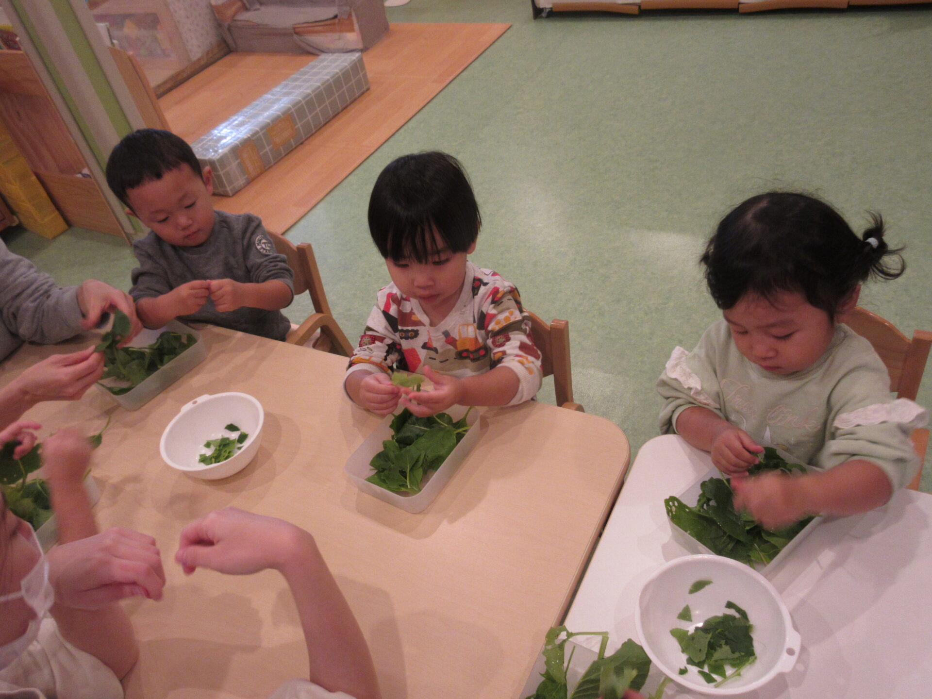 収穫後、その日のおやつ「小松菜蒸しパン」の中に入れてもらうため、葉を細かくちぎりました。