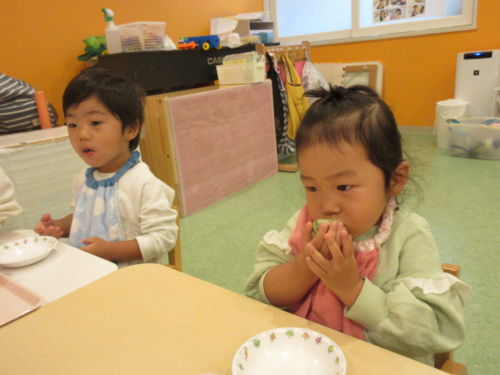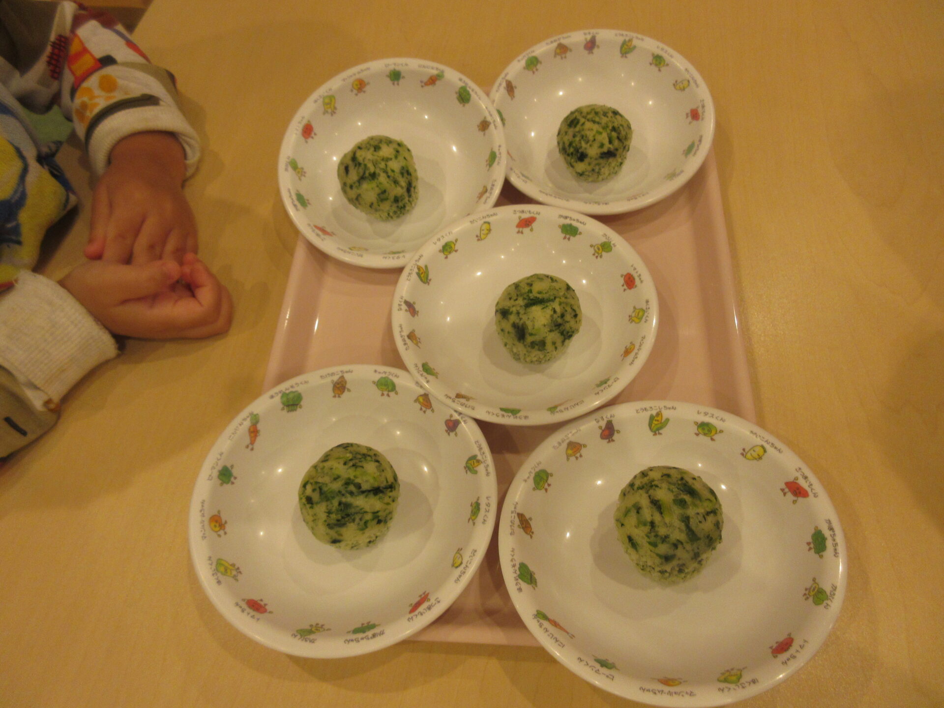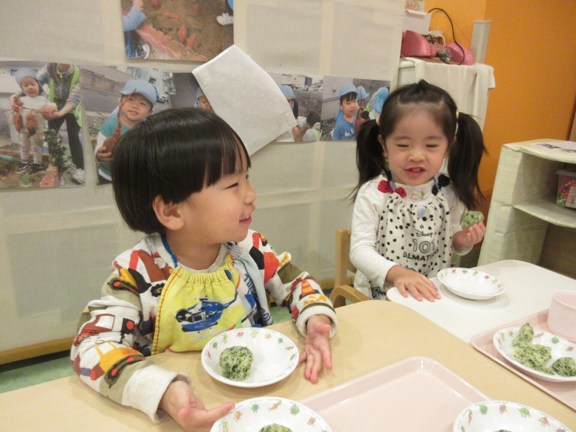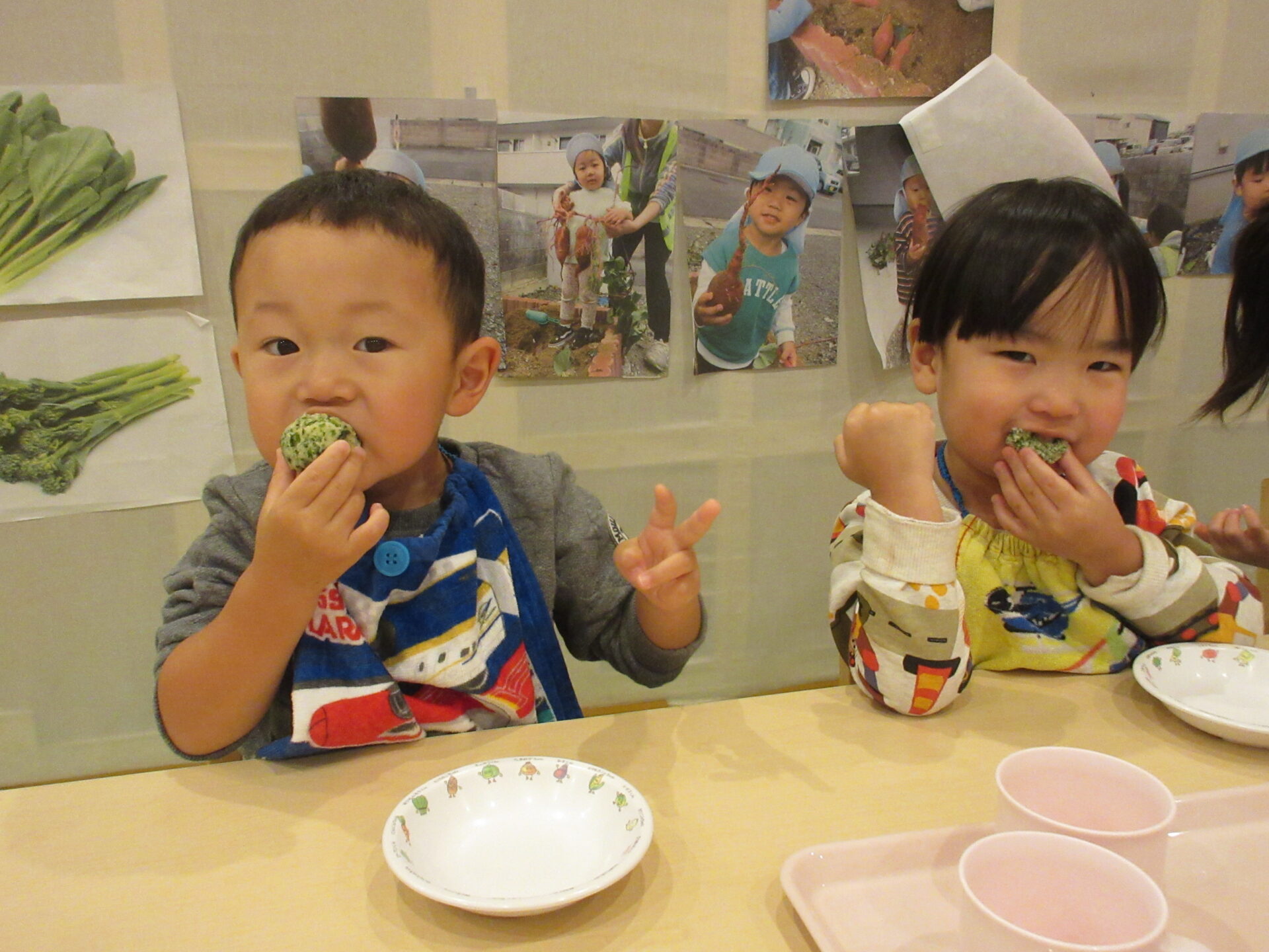 自分達が収穫し、ちぎった小松菜が入っている蒸しパンを見て「おいしそ~!✨」と目をキラキラさせていました。