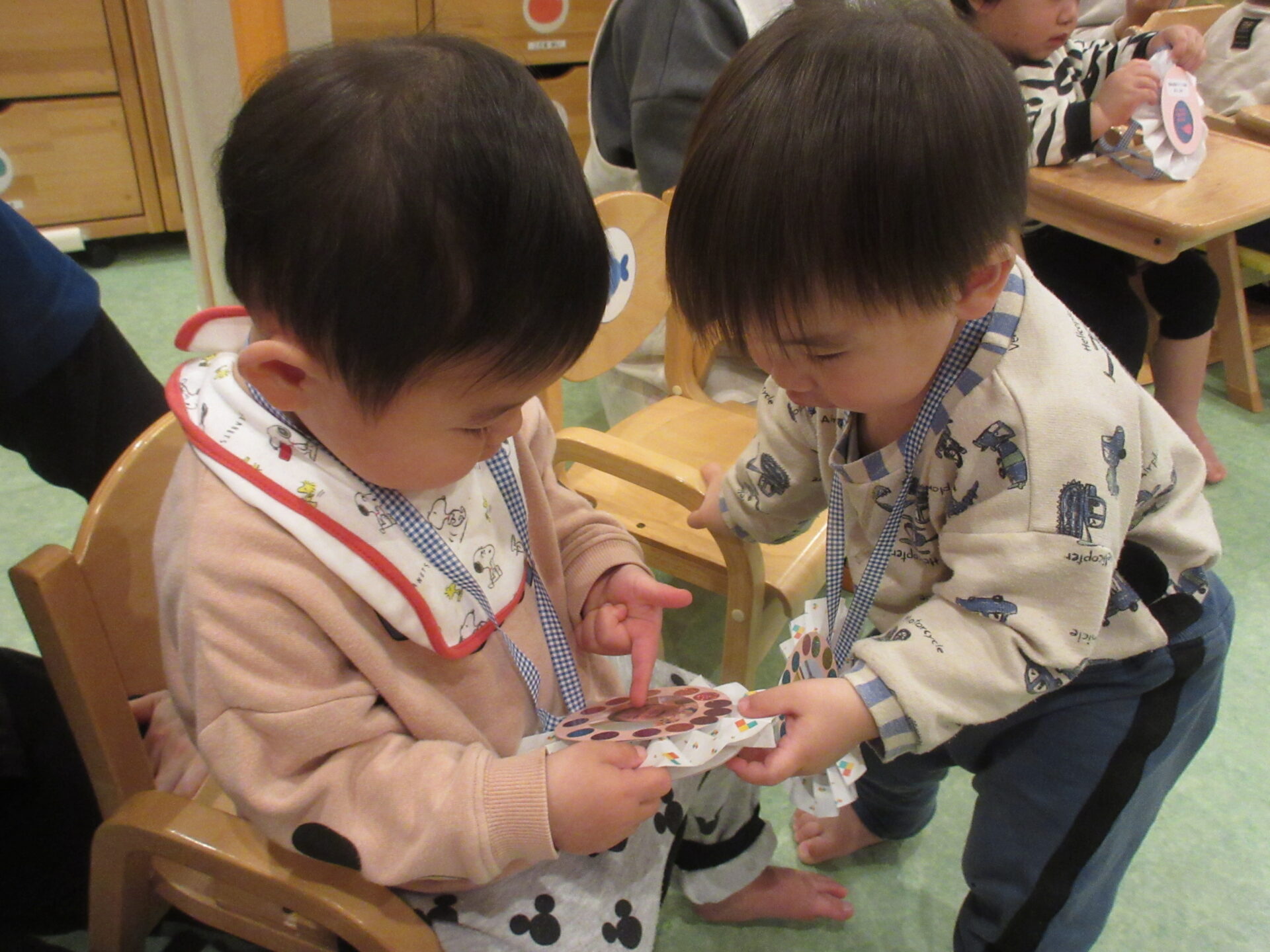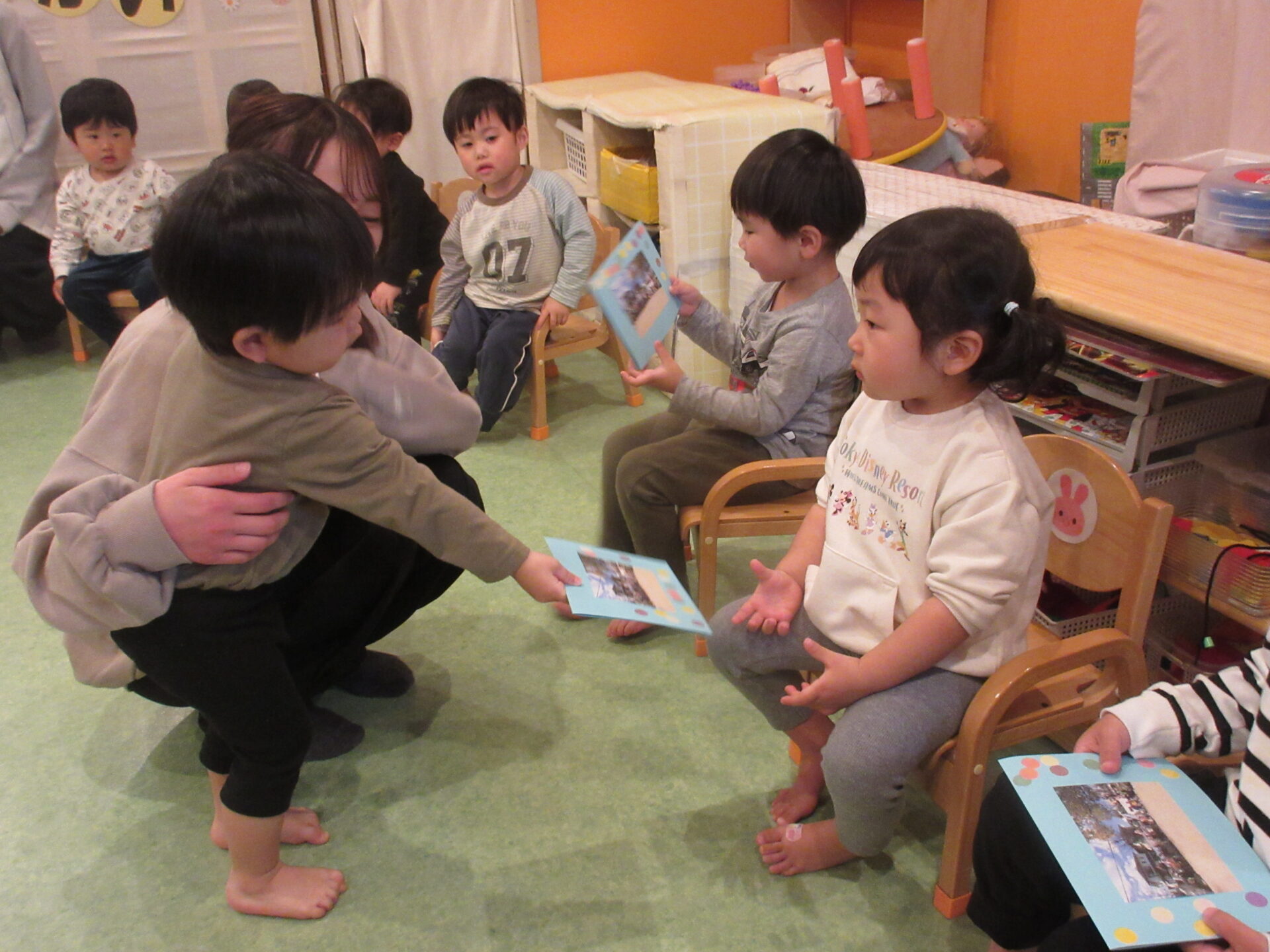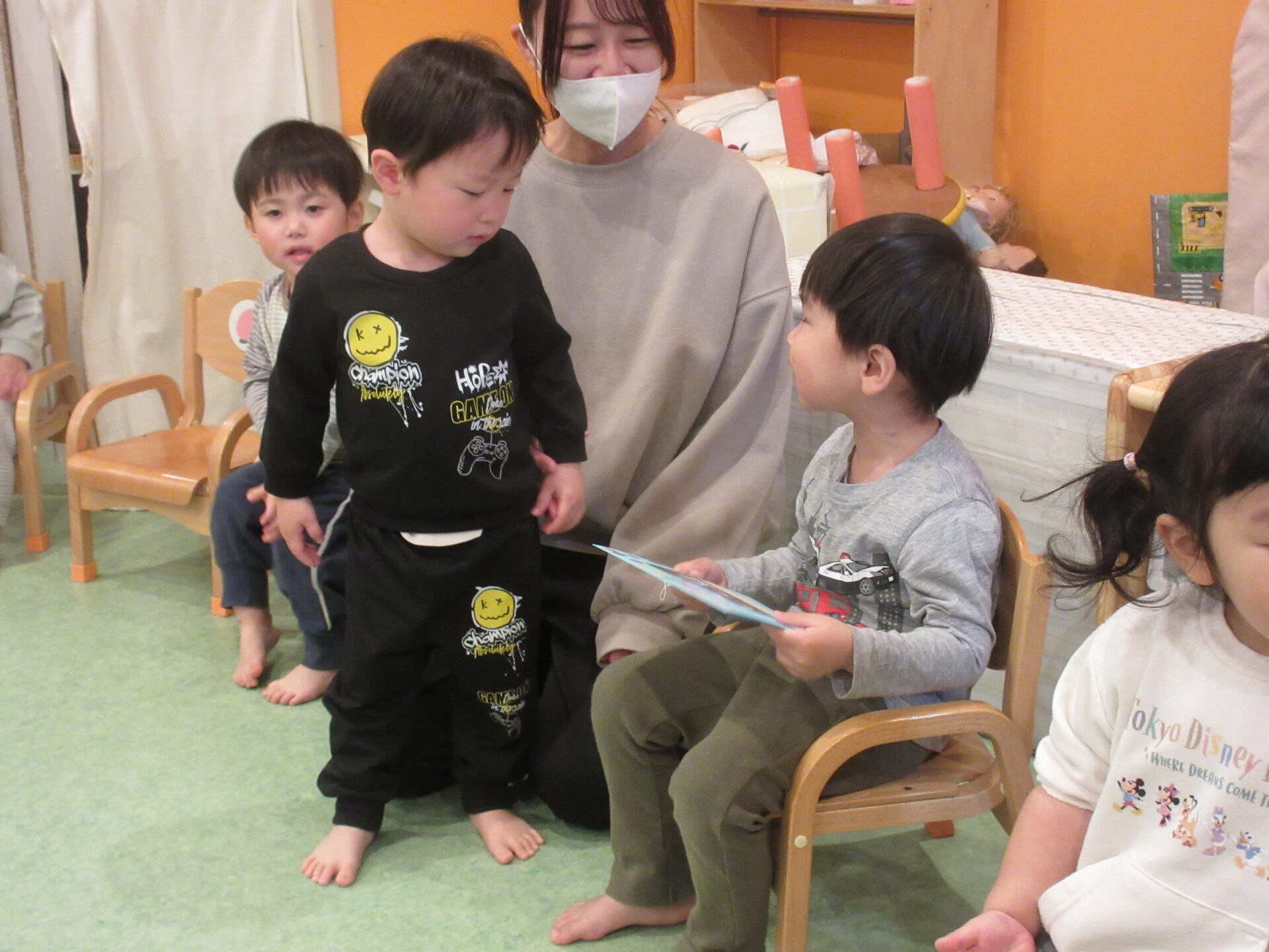 お歌のあとは、あめチームのおにいさん・おねえさんにメッセージカードのプレゼントを渡しました。